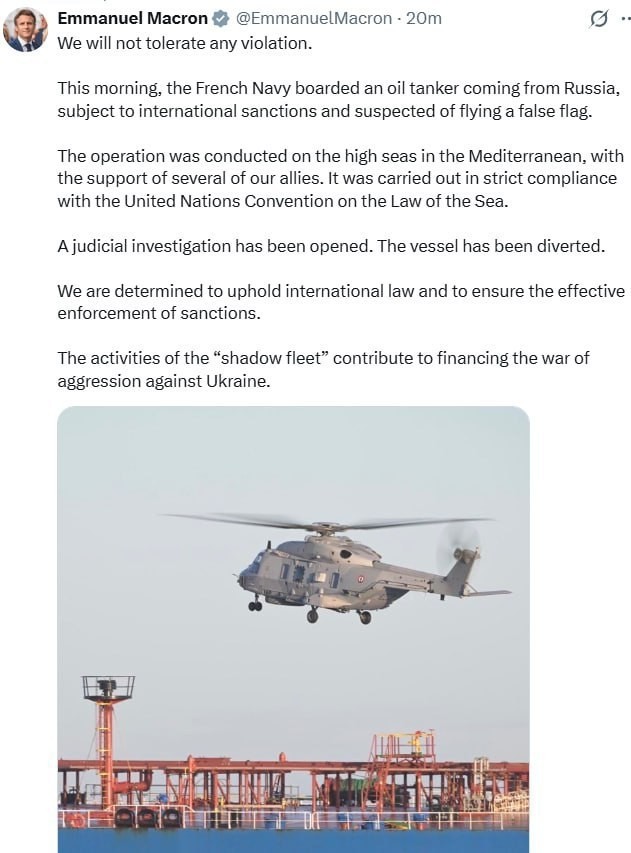 "Мы не будем терпеть никаких нарушений. Сегодня утром ВМС Франции поднялись на борт нефтяного танкера, следовавшего из России, подпадающего под международные санкции и подозреваемого в использовании ложного флага. Операция была проведена в открытом море в Средиземноморье при поддержке нескольких наших союзников и в строгом соответствии с Конвенцией ООН по морскому праву. Возбуждено судебное расследование. Судно было перенаправлено. Мы твёрдо намерены отстаивать международное право и обеспечивать эффективное соблюдение санкций. Деятельность «теневого флота» способствует финансированию агрессивной войны против Украины", - написал Эмманюэль Макрон в соцсети X.