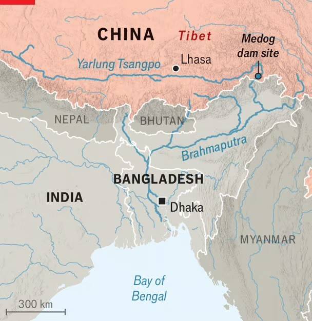 «Ее называют «Эверестом среди рек» из-за ее экстремального рельефа. Один участок Ярлунг Цангпо падает с высоты 2000 метров на участке длиной 50 км. Но что интересует китайских чиновников, так это гидроэнергетический потенциал реки. 25 декабря 2024 года государственное информационное агентство «Синьхуа» сообщило, что Китай одобрил планы по строительству крупнейшей в мире гидроэлектростанции в нижнем течении Ярлунг Цангпо, которая течет из Тибета в Индию и Бангладеш (см. карту).