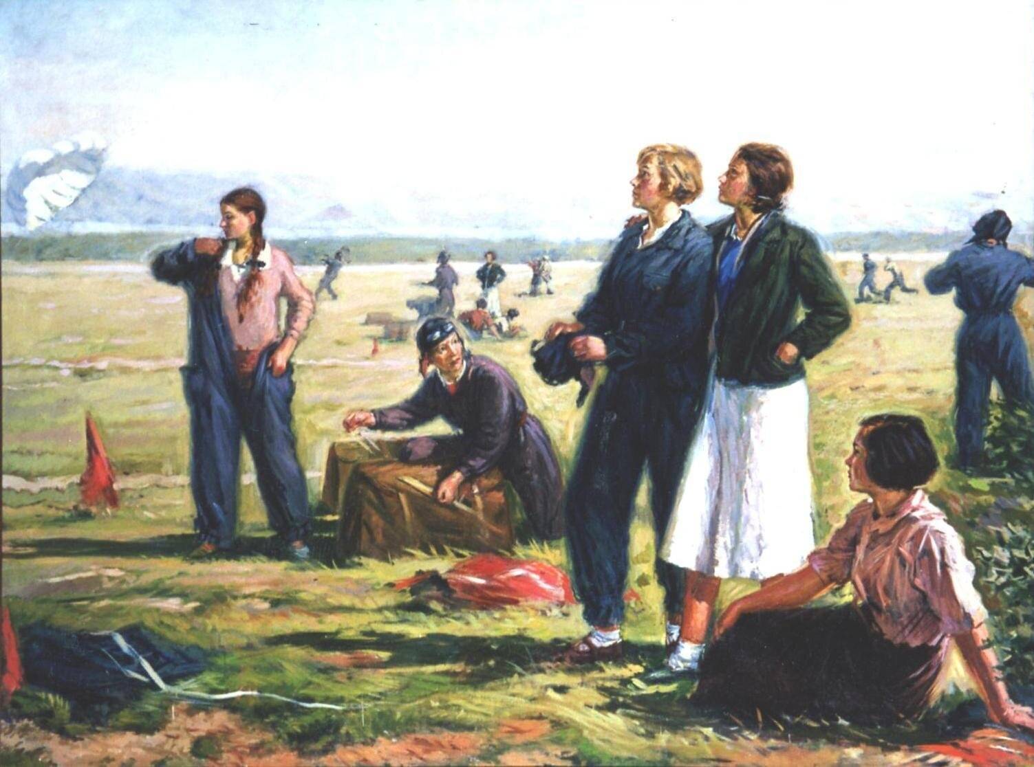 А вот и парашютистки. На полотне Константина Дорохова «Перед прыжком» (1937) мы видим сильных девчат, которые готовятся совершить маленький подвиг — большие подвиги ещё впереди!