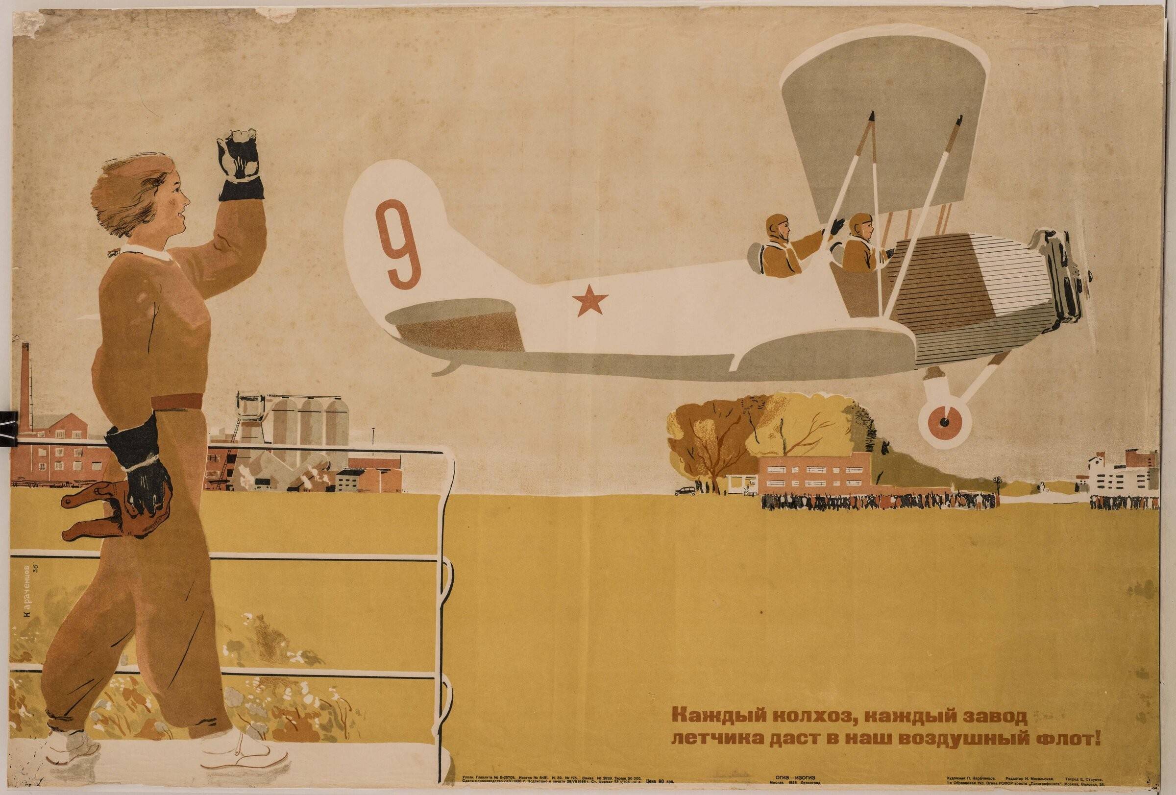 Вот — плакат графика Петра Караченцова «Каждый колхоз, каждый завод лётчика даст в наш воздушный флот!» (1936). Показана юная дева в лётной форме, провожающая аэроплан. Классически выверена работа Константина Юона «Портрет лётчицы Марии Зимовой» (1937). Сергей Герасимов представлен коллективным портретом Валентины Гризодубовой, Полины Осипенко и Марины Расковой (1939) — трёх великих героинь, покоривших пространство.