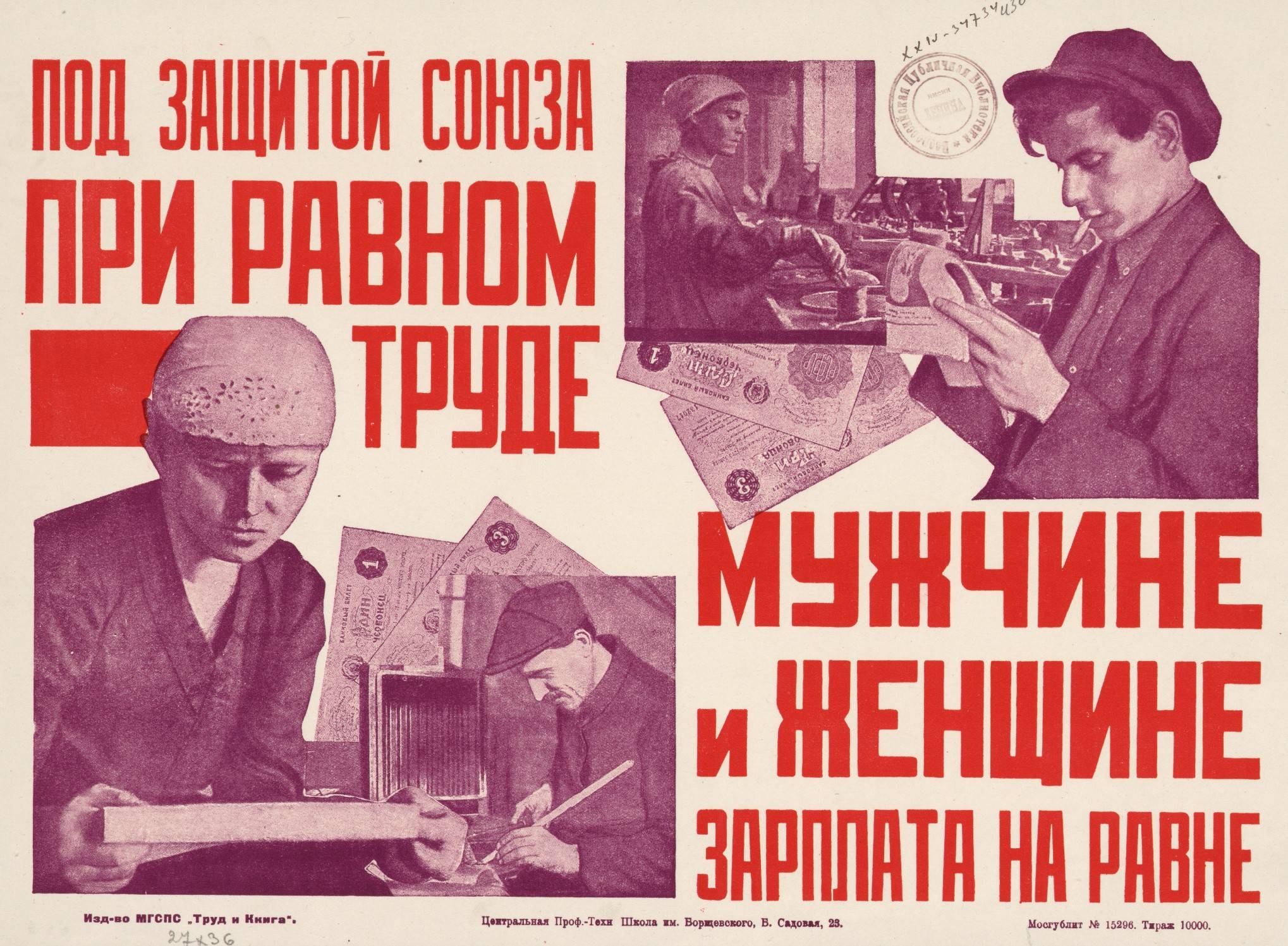 Основной типаж — труженица, фемина в красной косынке у станка. На стендах — разнообразные плакаты, призывавшие идти в индустрию, не замыкаться в домашне-бытовой среде. Повсеместно возникали фабрики-кухни, где можно взять готовый обед, не корпеть над примусом и плитой. Малышей — в ясли и детский сад. В будущем, как писали в брошюрах, детей будет воспитывать само государство.
