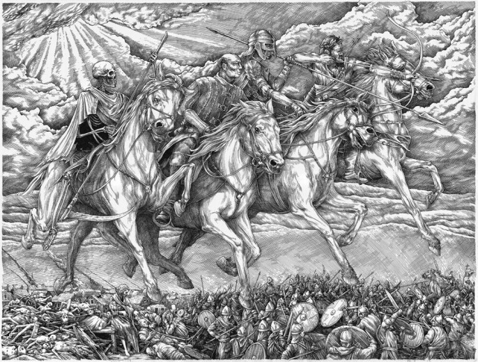 У моего папы была открытка с изображением четырёх всадников Апокалипсиса. Признаться у него было немного предметов, которые мне запомнились. Трофейный, немецкий кортик, томик Сервантеса, пачка билетов Государственного займа 1982-го года и эта открытка. Наверное, всё-таки было ещё что-то, но память дополнительно ничего не предлагает.