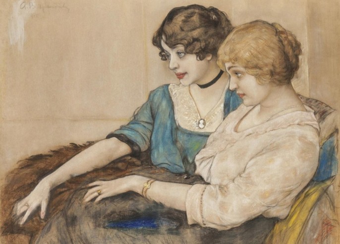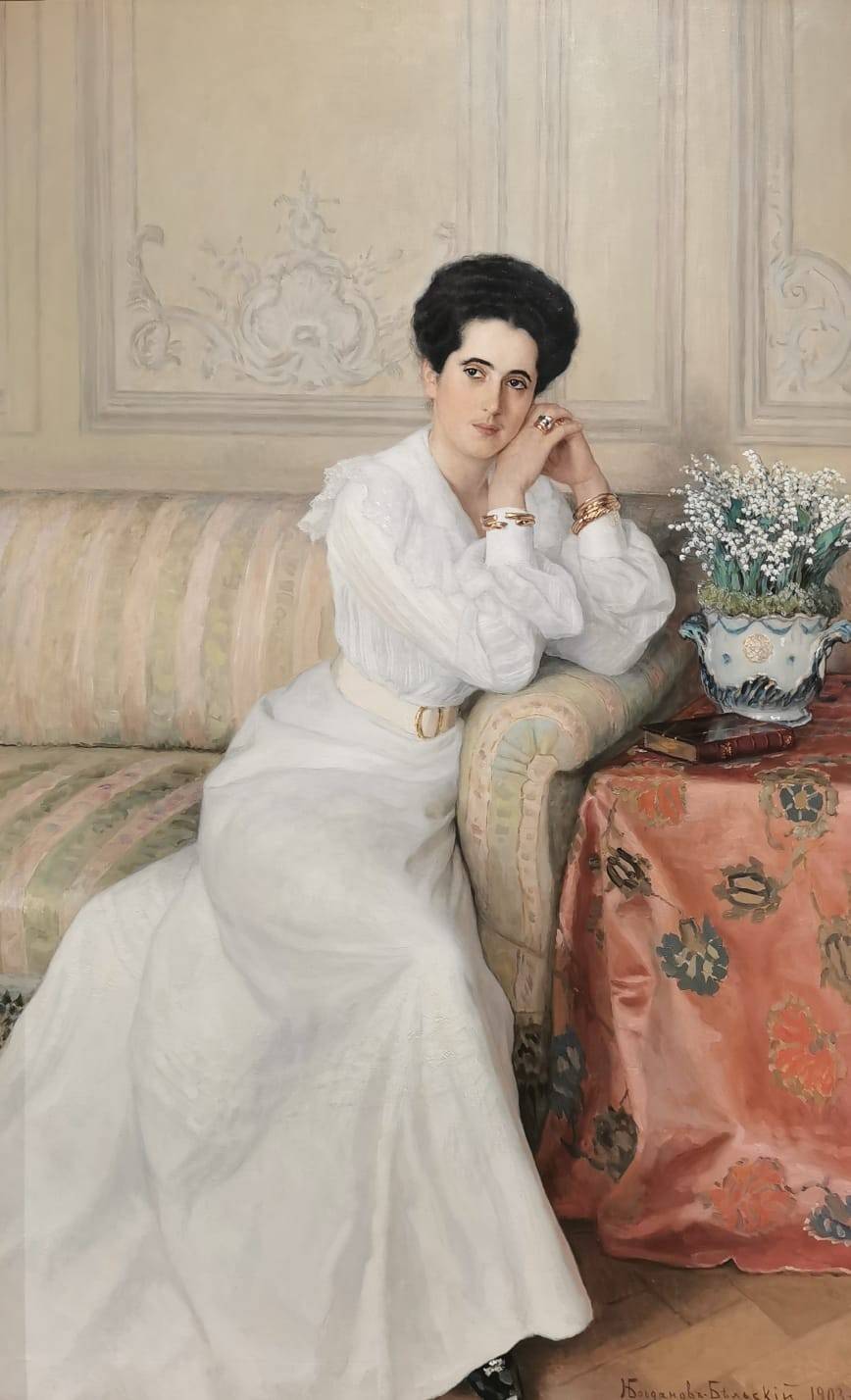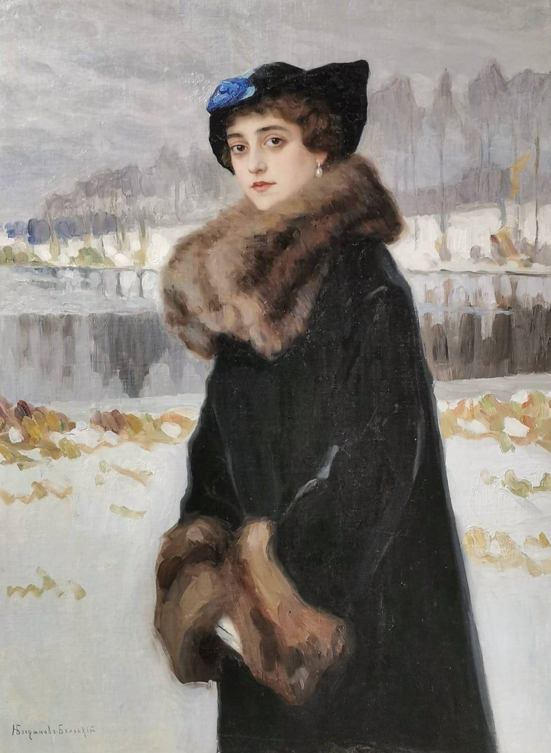 Хороша картина Николая Богданова-Бельского, знаменитого своими романтизированными сюжетами о крестьянских детях. Тут Богданов-Бельский выступает, как умело льстящий портретист. Ещё бы – заказчицей выступила княгиня Мария Кудашева. Она позировала в собственном особняке, в белом домашнем платье – невероятно скромном и элегантном. Удачен его же портрет балерины Мариинского театра Людмилы Бараш-Месаксуди – одной из самых привлекательных женщин Петербурга. Она изображена в шубке-ротонде посреди заснеженного пейзажа. Отлично выписанное одеяние и глубокие очи, в коих можно утонуть! «Упоенье любовное Вам судьбой предназначено / В шумном платье муаровом, в шумном платье муаровом / Вы такая эстетная, Вы такая изящная…», - тянул Игорь Северянин, стихи которого легко цитировать при взгляде на все эти картины.