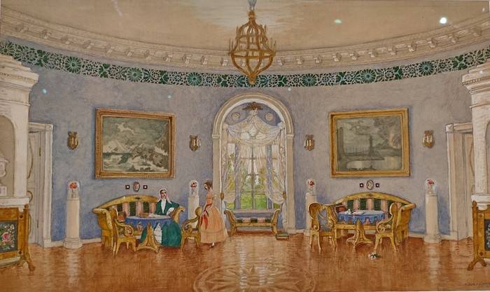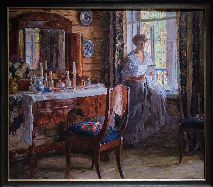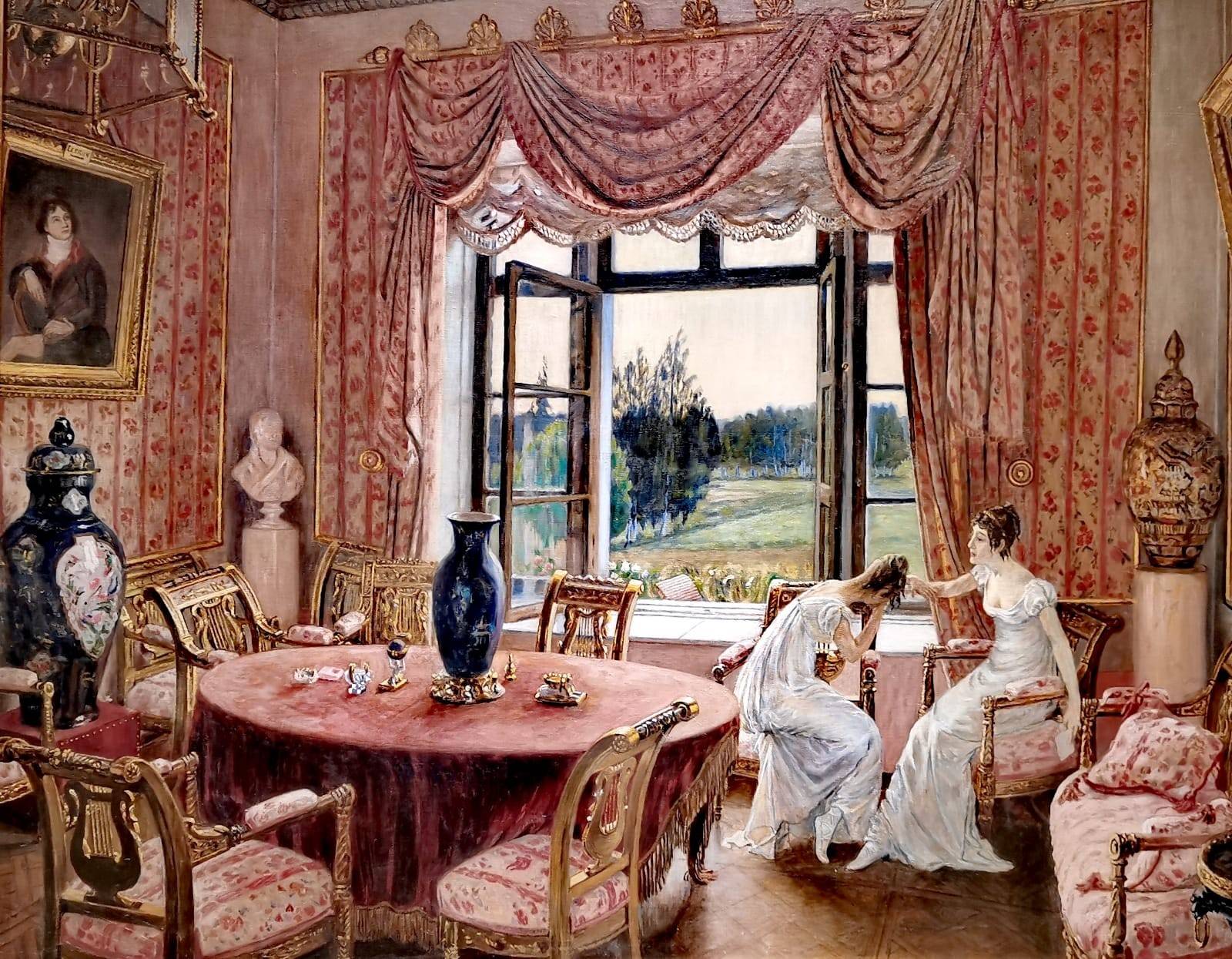 Потому-то востребованы картины и рисунки, обращённые в прошлое – эскапизм благорастворения! Сомовские «Дамы в парке» исполнены тонкой меланхолии - вздохи по галантному столетию с его маскарадной суетой и фижмами. «В гостиной» Александра Рубцова – дивная, чуть глуповатая мешанина стилей, так как женщины одеты в платья 1800-х, а меблировка вся сплошь 1830-1870-х. Ампирная белизна посреди наворотов бидермайера и «второго рококо» — это ностальгическая фантазия без привязки к датам.