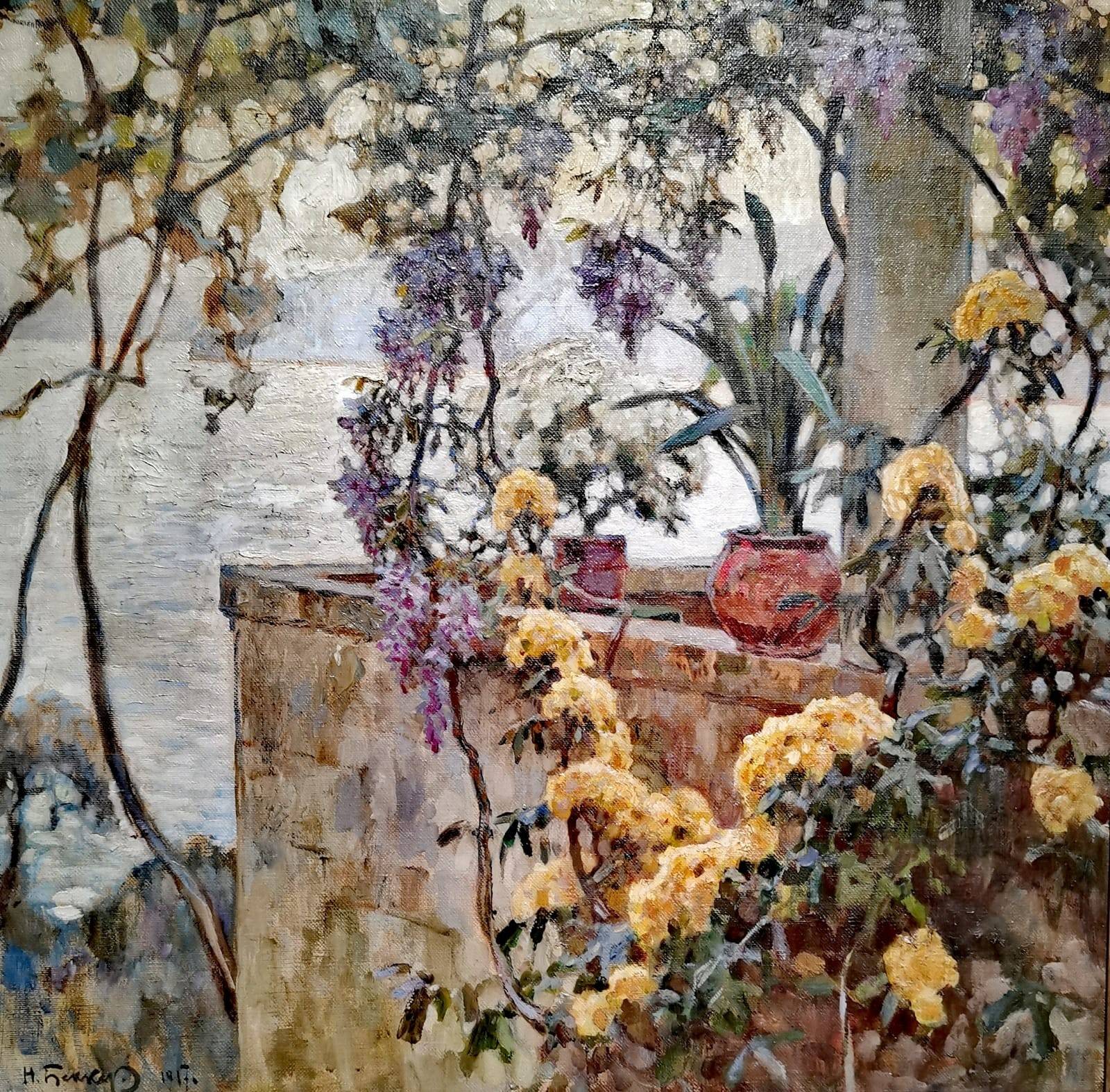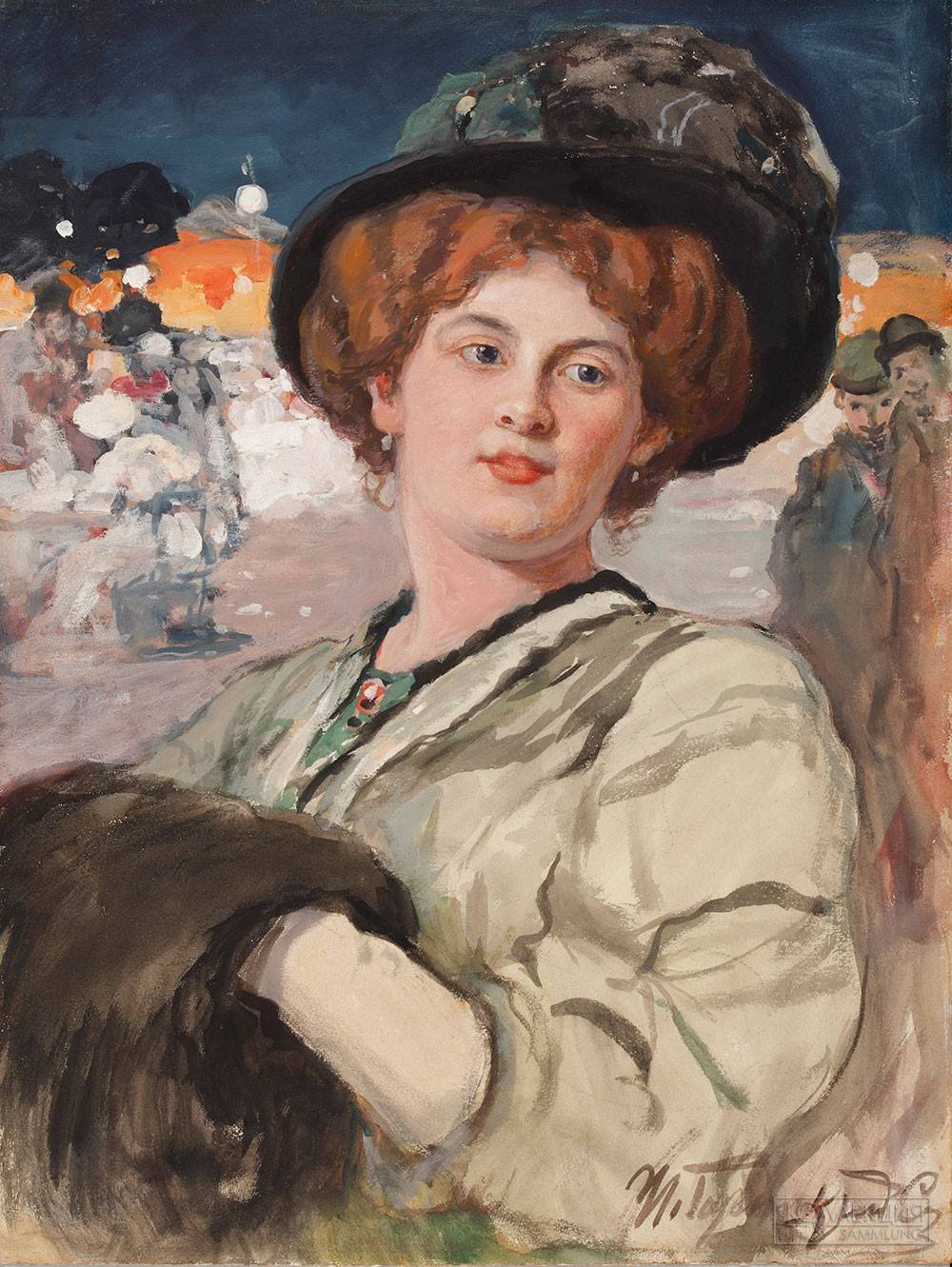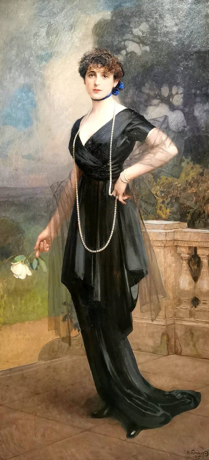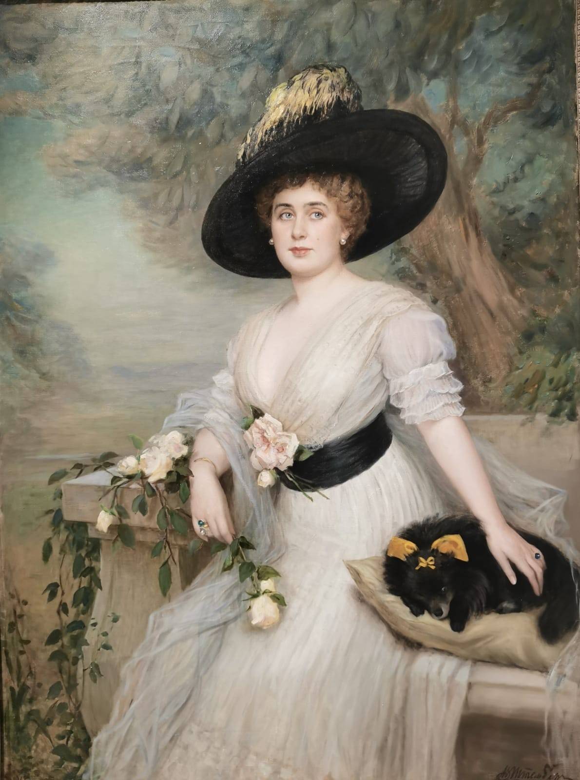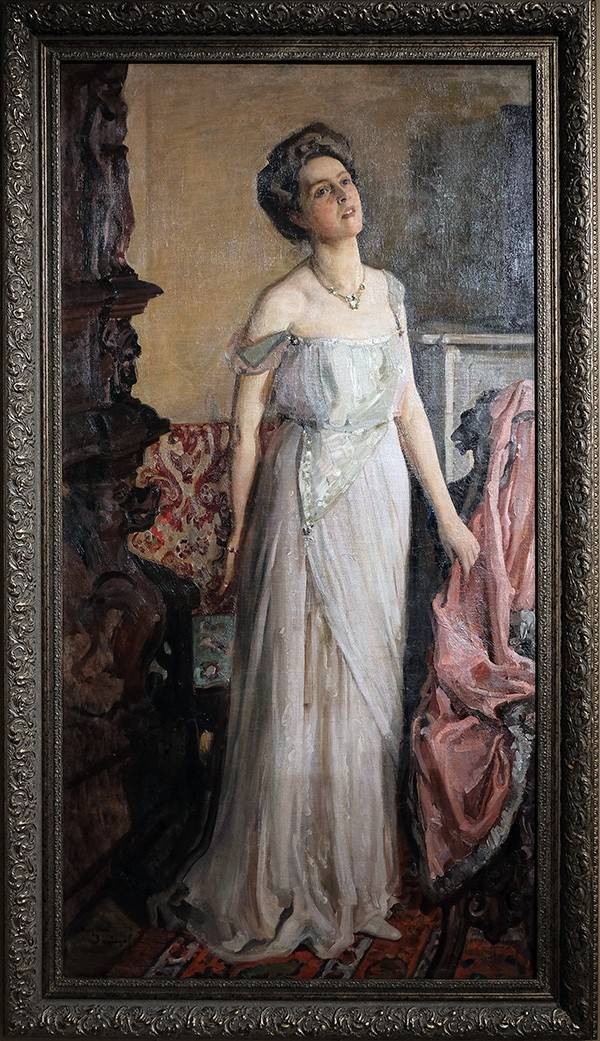 Рядом – портрет баронессы Дарьи Гревениц кисти Виктора Штембера. Она вся в белом, а на контрасте – чёрный кушак и чёрная шляпа с перьями. Розы, декоративный фон и спящая собачка, увенчанная бантиком. Эта вещь на грани безвкусицы, но у салонного жанра – свои нюансы. Презанимательна личность самой баронессы – в её жилах текла кровь Романовых, Богарне и Лейхтенбергов; она несколько раз была замужем, и это не говоря уже об амурных приключениях; отличалась храбростью и авантюризмом – в 1914 году отрядила санитарный поезд и рванула на фронт, с восторгом приняла Февральскую революцию, так как была в перманентной ссоре с Николаем II, но сбежала от Октябрьской. И это ещё не всё – в 1920-х вернулась, дружила с видными деятелями, подвизалась в крупной библиотеке, но в 1937 году в разгар ежовщины была арестована и расстреляна. Могла ли знать свою судьбу эта патрицианка, позировавшая Штемберу? Во всяком случае, она всегда слишком ярко горела.