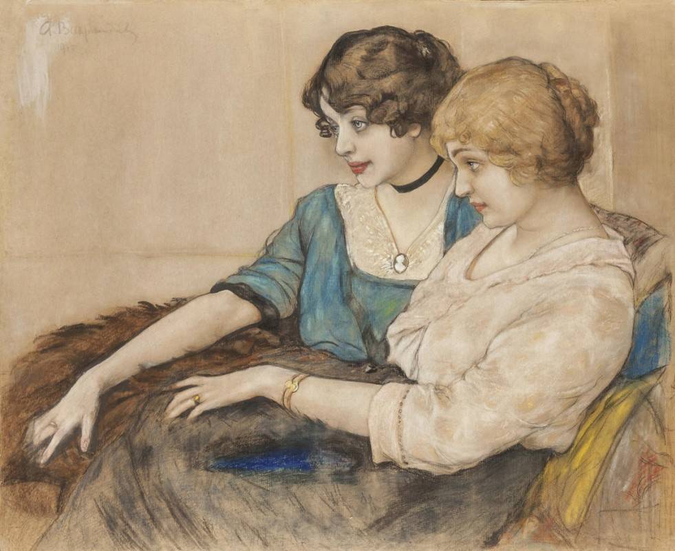 Одна из лучших вещей на выставке - рисунок Александра Вахрамеева «Подруги Тата и Валя». Одной из позирующих девушек явилась его младая возлюбленная Татьяна Трофимова, Тата, дочь пензенского инженера-железнодорожника. Гуашь, пастель, точные линии. Свежесть лиц и вьющиеся волосы – тогда в ходу была завивка-ондуляция, если уж природа не дала завитков. Превосходны работы Исаака Бродского – будущий родоначальник Ленинианы здесь выступает, как лирический портретист. Изображения богемно-светской дамы Зинаиды Штильман и балетной танцовщицы Нины Чернобаевой – настоящие жемчужины экспозиции.