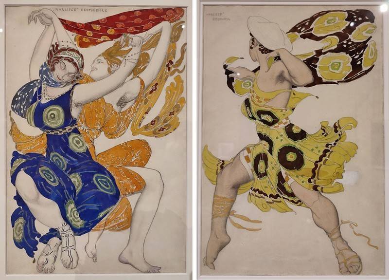 Тут же - декорации Мстислава Добужинского к «Месяцу в деревне» Ивана Тургенева. Порадовали эскизы Льва Бакста к балету «Нарцисс» Николая Черепнина. Эти постановки считались, как теперь это называют, культовыми – шли смотреть не только на артистов – важным было и обрамление. Журнал «Столица и усадьба» частенько публиковал подобные рисунки, сопровождавшиеся тщательным описанием. В те годы царила всеобщая театральность бытия – ни слова в простоте, а потому сценические образы мягко сливались с повседневностью, и уже нельзя было понять, кто перед нами – ибсеновская героиня или соседка по имению.