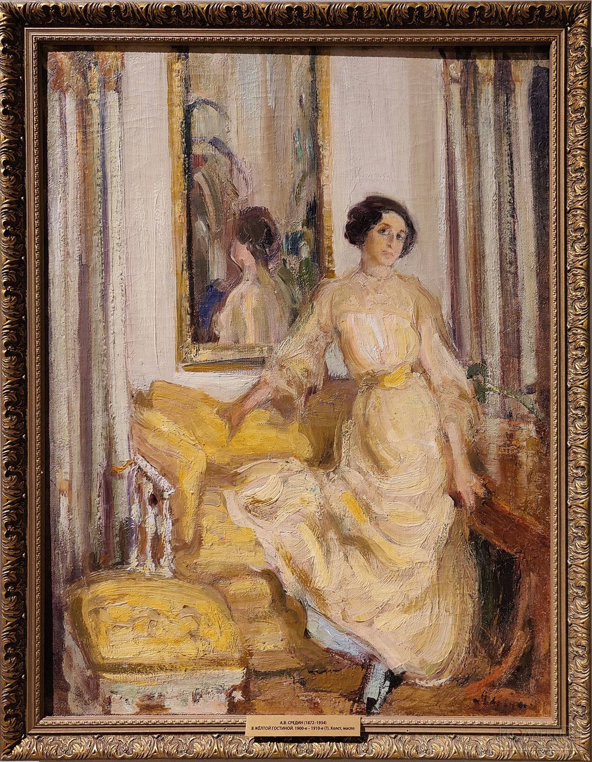 Среди экспонатов - портрет Надежды Сапожниковой, написанный Николем Фешиным. Казанская художница, интеллектуалка и меценатка из купеческого рода, Надя окончила гимназию и музыкальную школу, занималась декоративно-прикладным искусством, а когда ей было уже двадцать семь лет (более, чем зрелый возраст по меркам 1900-х годов!) пошла учиться живописи к Фешину. Ходили слухи о её страстном романе с ментором, ибо тот возил её в Париж, бесконечно писал портреты, в которых прослеживалась тонкая интимность, но женился-то на другой. Что касаемо Сапожниковой, она так никогда и не вышла замуж.