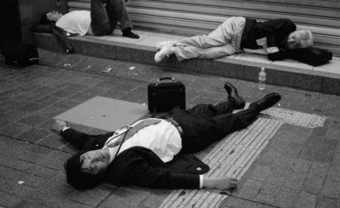 Японец выходит из дома в 7 утра. На работе он существует в жестких рамках своего статуса. После окончания официального рабочего дня он берёт дополнительные часы, потому что ему надо кормить семью. Затем он отправляется пить с коллегами и возвращается оттуда домой в 2 часа ночи, вероятней всего пьяным. Он работает по субботам. Видит свою семью только по воскресеньям. Причем до вечера весь выходной он может либо спать, либо пить, потому что находится в жутком стрессе от такого жестокого режима.