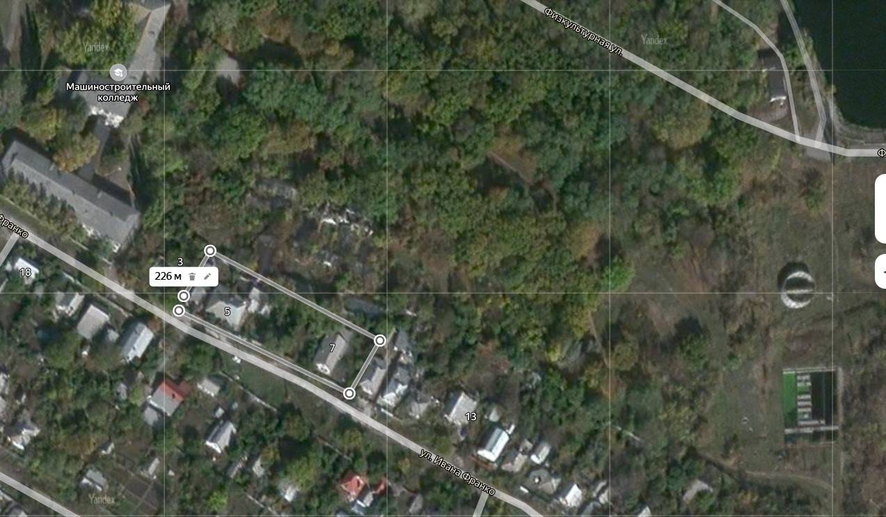 Нынче я от престарелой, почти слепой мамы долго не мог добиться, где именно этот наш дом находился, хотя уже несколько последних лет пытался это сделать. А сегодня произошло чудо, она назвала мне улицу (Таманская), на которой жила моя тётя, описала окружающий пейзаж, который мы наблюдали по дороге с остановки. Я быстренько всё за-яндекс-картил и легко нашёл место нашей семейной Стены плача. Я даже вспомнил этот парк и этот ставок - запруду на речке Корсунь. Меня маленького в нём пьяный муж двоюродной сестры чуть-чуть не утопил, уронив с плеч под воду. Вспомнил шум водопада на плотине. Те воспоминания смутны и размыты, но они всё же сохранились. И я, с маминой помощью, нашёл таки место, где стоял наш дом с погрешностью 50 или 75 метров. Место отмечено прямоугольником правее техникума на улице Ивана Франко.