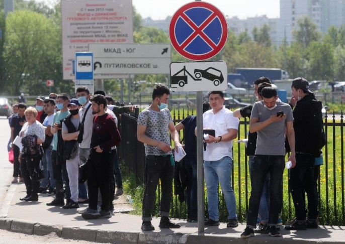 Фото: Сергей Фадеичев/ТАСС. Красногорск. Мигранты у Единого миграционного центра Московской области в Путилково.