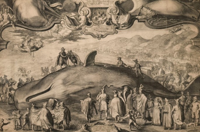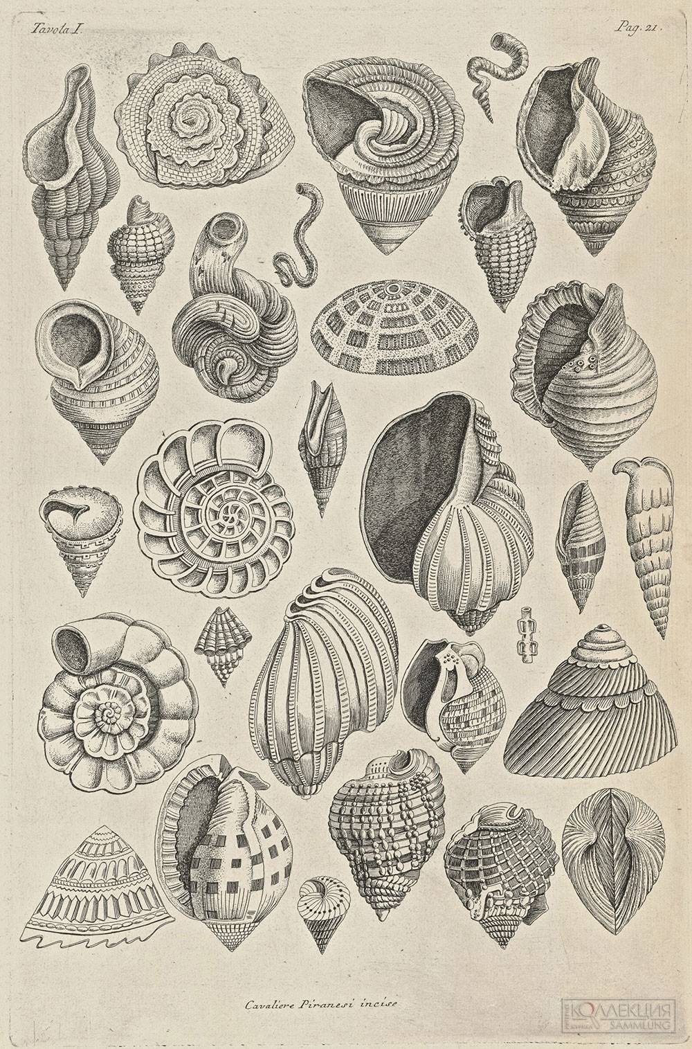 Нашлось место на выставке и морским чудесностям. Огромен и пугающ «Кит, выбросившийся на берег близ Бевервейка» (1602) Яна Санредама. Люди рядом с гигантом – как лилипуты близ Гулливера. Собственно, для голландцев кит не являлся экзотикой - китобойные рейды проводились с конца XVI столетия. Вместе с тем, сильное животное по-прежнему порождало оторопь. Фламандец Адриан Колларт представлен гравюрой «Кит, тюлень и кефаль» (конец XVI – начало XVII вв.). Автор что-то намудрил с размерами - кефаль не так уж велика. Однако это не натурное наблюдение, а своеобразная реклама добывающих промыслов – фоном идёт море, некий город и «шаланды полные кефали». Волшебен каталог раковин (1769) от Джованни Пиранези, выполнявшего заказ для коллекционера и доктора Никколо Гвалтьери.