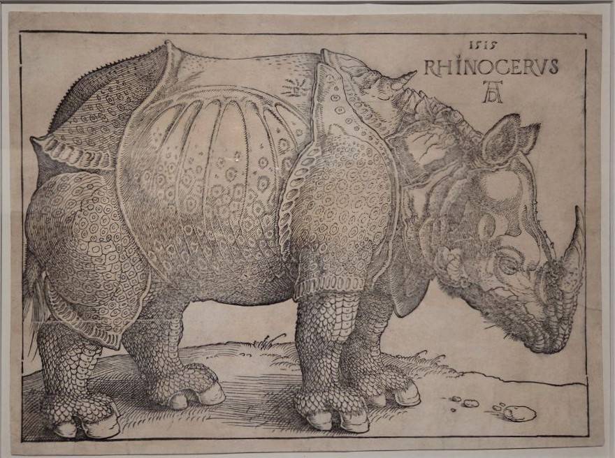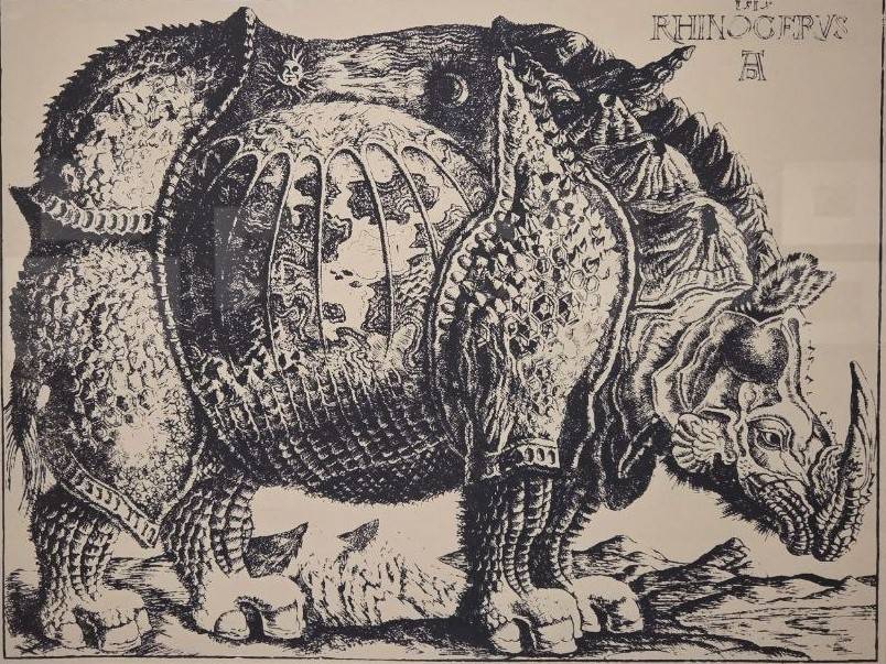 Как бы то ни было, гравюра Альбрехта Дюрера по сию пору вызывает неподдельный восторг – техникой исполнения и новаторской смелостью. На выставке можно увидеть работу советского, русского нонконформиста Дмитрия Плавинского, создавшего некое постмодернистское осмысление того «Носорога» (1995) - в тело животного вмонтирован глобус, зарешеченный железными прутьями, а на спине носорога - луна и солнце.