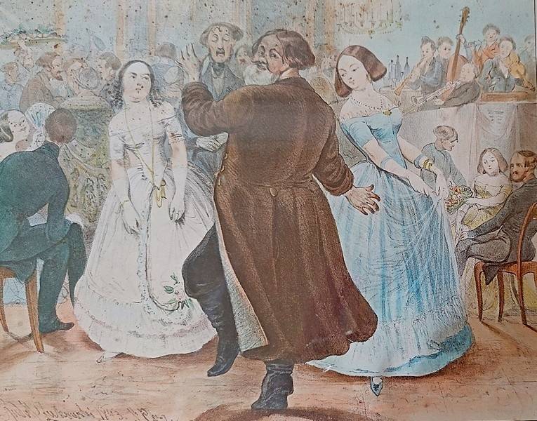 На карикатуре Жуковского «Мазурка» мы наблюдаем танцы в шумном собрании – толстый коммерсант, одетый в кафтан, сапоги «бутылками» и причёсанный на прямой пробор, пляшет вовсе не мазурку, но какой-то пьяный танец. Фраппированы две девицы, что стараются отвести взоры. Наверняка, дочери, коих вывезли на бал. Кстати, по этой картинке можно уяснить, что купеческие дщери в середине XIX столетия уже перешли на европейскую моду, а их отцы всё ещё держались старого образца. Девицы одеты, как в Париже, а папаша, видите ли, позорит их своими разудалыми прыжками и допотопным кафтаном! Тут надо смотреть шире – мужская одежда, как таковая, всегда была консервативнее женской, а привычки русских купцов – частный, хотя и ярчайший, случай.