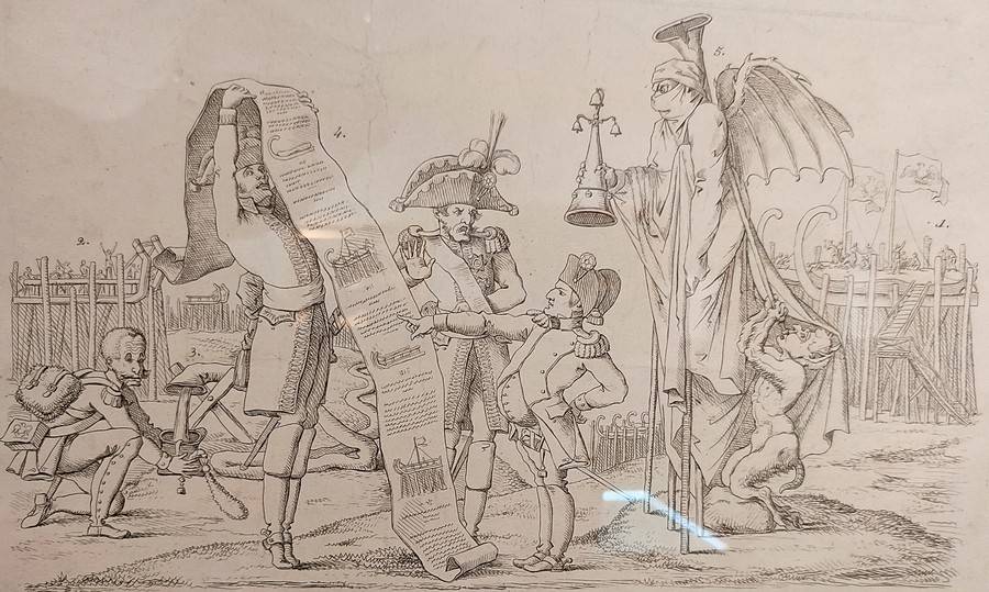 Часть экспозиции посвящена битвам 1812 года и общенародному подвигу. Автор картинок - Иван Теребенёв, а поэтому те карикатуры именовались «теребенёвские листы». Его стиль был чем-то средним между британской политической карикатурой и русским лубком, что сделало те «листы» популярными, как в России, так и на Западе.