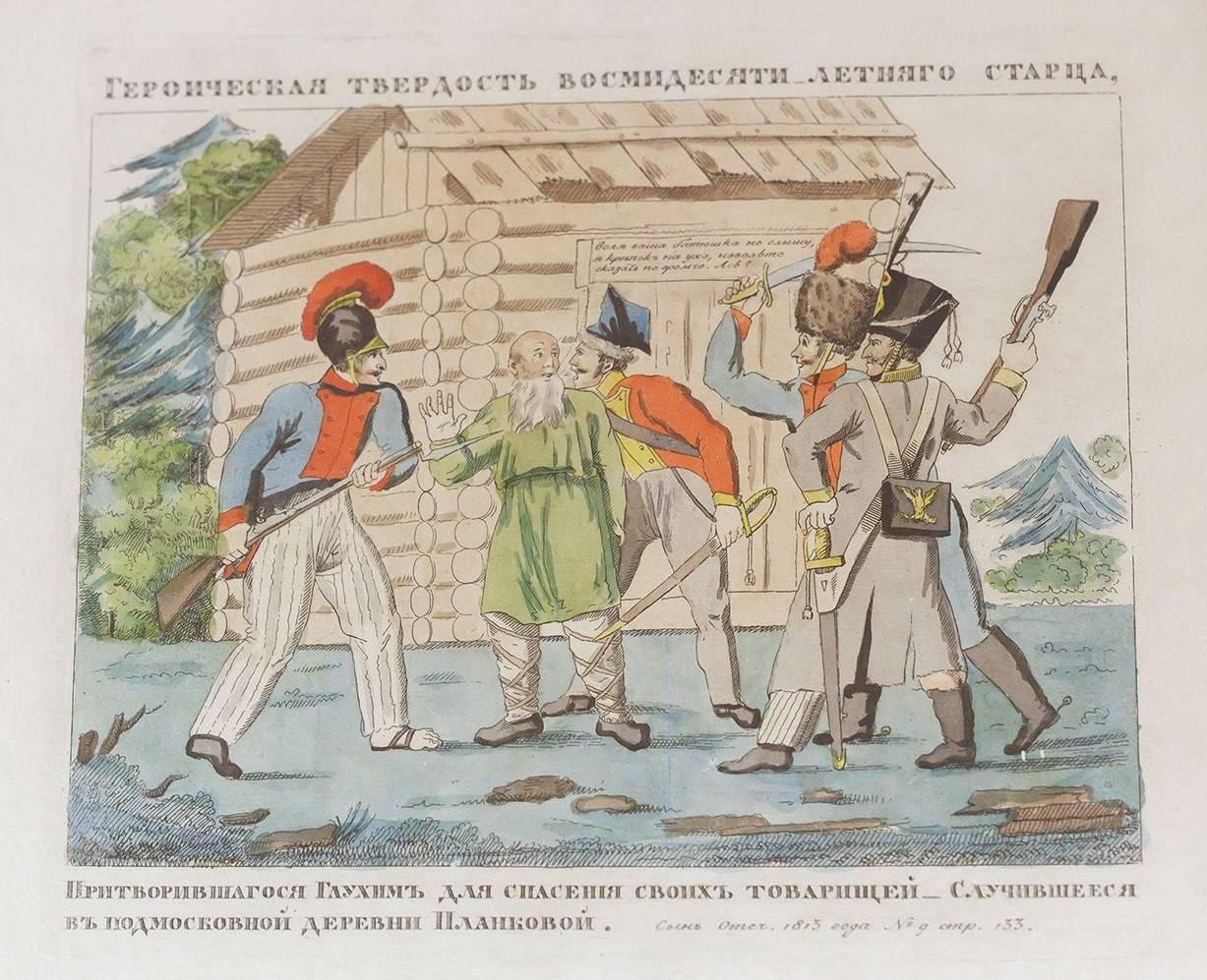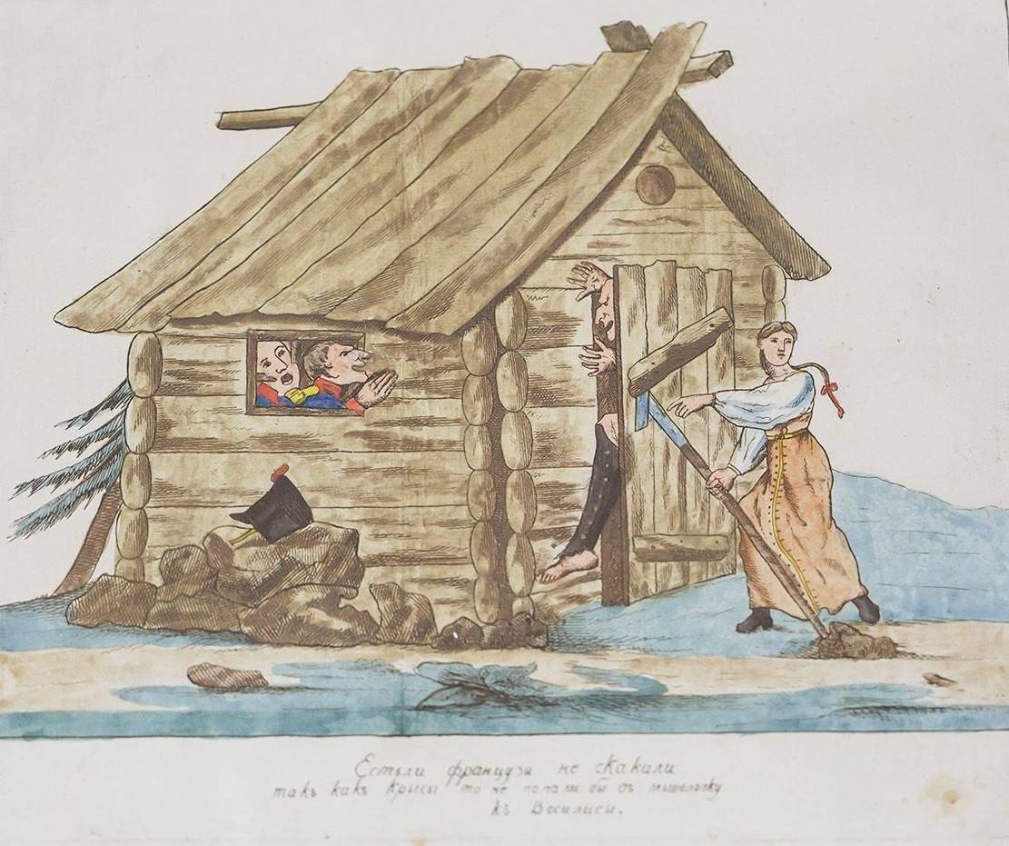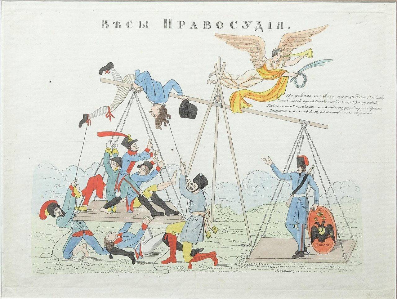 Вот – легендарная старостиха Василиса Кожина запирает оккупантов каком-то сарае. Всё это венчается подписью: «Если бы французы не скакали так, как крысы, то не попали бы в мышеловку Василисы». А тут – подвиг восьмидесятилетнего старика, притворившегося глухим, чтобы не выдать ничего врагам. На картинке «Весы правосудия» русский воин в одиночку перевешивает всю орду, пришедшую с Наполеоном - те самые «двунадесять языков». Если предыдущие рисунки были сделаны на стыке лубка и британской карикатуры, то «Наполеон с проектами снарядов» можно перепутать с расхожей лондонской сатирой, где не менее знатно вышучивали «корсиканского артиллериста».
