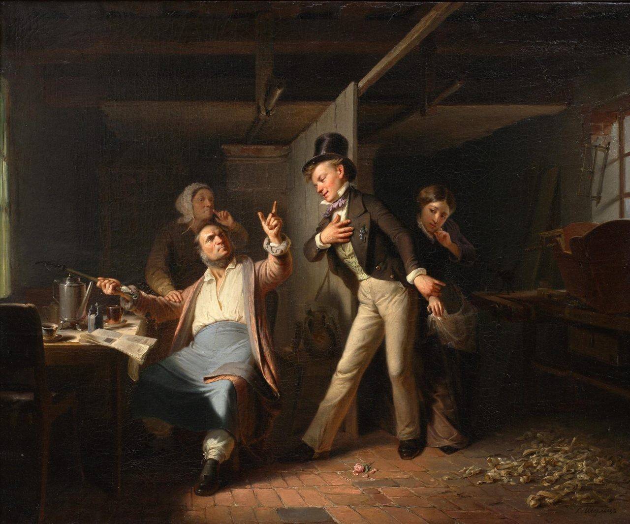Кроме рисунков, тут есть и картины – допустим, полотно Карла Шульца «Подмастерье-столяр просит руку дочери своего мастера». Юный ремесленник оделся со всей тщательностью – на нём фрак, цилиндр, узкие брючки. Позади – дочка, бледноватая, хорошенькая дева. Сам хозяин, понимающий, что за этим сватовством стоит не одна симпатия, но и расчёт, произносит какую-то выспреннюю речь. Здесь презабавны выражения лиц – у подмастерья оно масляно-лукавое, у мастера – торжественное, словно он играет короля Лира.