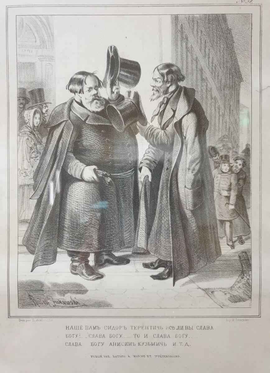 Буржуа противопоставлялись образованной, изящной аристократии. Купцы часто рисовались невежественными, а их разговоры - односложными, если не касались бизнеса. Карикатура Жуковского «Два купца» - негоцианты приветствуют друг друга. Из сообщений – только здравия. Дескать, бородатые воротилы только и умеют, что поздороваться и сказать: «Слава Богу!»