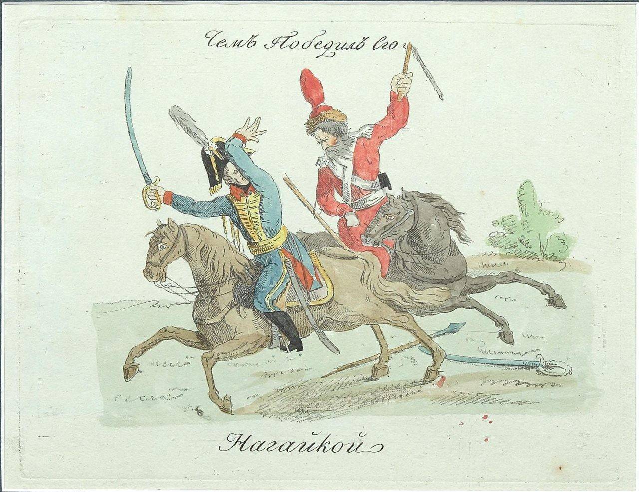 Другой мастер, создававший боевые листки – сам Алексей Венецианов, чьи рисунки также представлены в экспозиции. «Чем победил его? Нагайкой» — это динамичная сцена, где русский мужик гонит французского офицера нагайкой, а тот, имея саблю, и не думает сопротивляться. Вывод: правое дело победительно априори, даже, если в руках всего лишь ременная плеть супротив острого лезвия. Сейчас невозможно было бы назвать эту вещь собственно карикатурой. Это что-то, вроде быстрой зарисовки с натуры и, как уже отмечалось, манера сатирического изображения значительно изменилась.