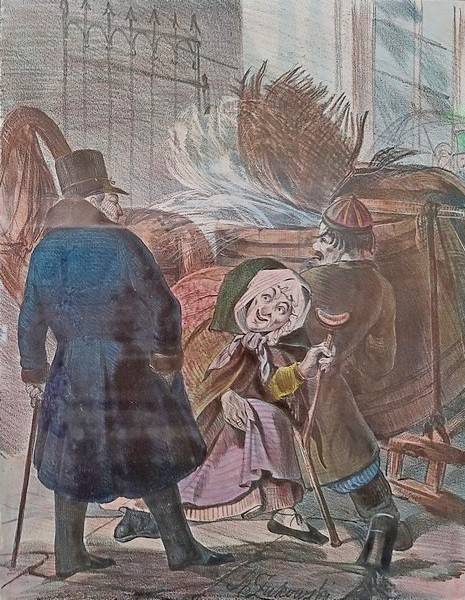 На выставке довольно много картинок, созданных Рудольфом Жуковским, крепким рисовальщиком, книжным и журнальным иллюстратором, первым оформителем «Конька-Горбунка». Стилистика Жуковского отличалась яркой прорисовкой деталей и особой выразительностью. Вот – его «Салопница» - тётка с жуликовато-хитроватым выражением лица. Кто же такие салопницы? Так называли пожилых приживалок и попрошаек, как правило, из мещан или обедневшего дворянства. Кличка была дана по главному атрибуту – салопу - широкой длинной накидке с прорезями для рук.