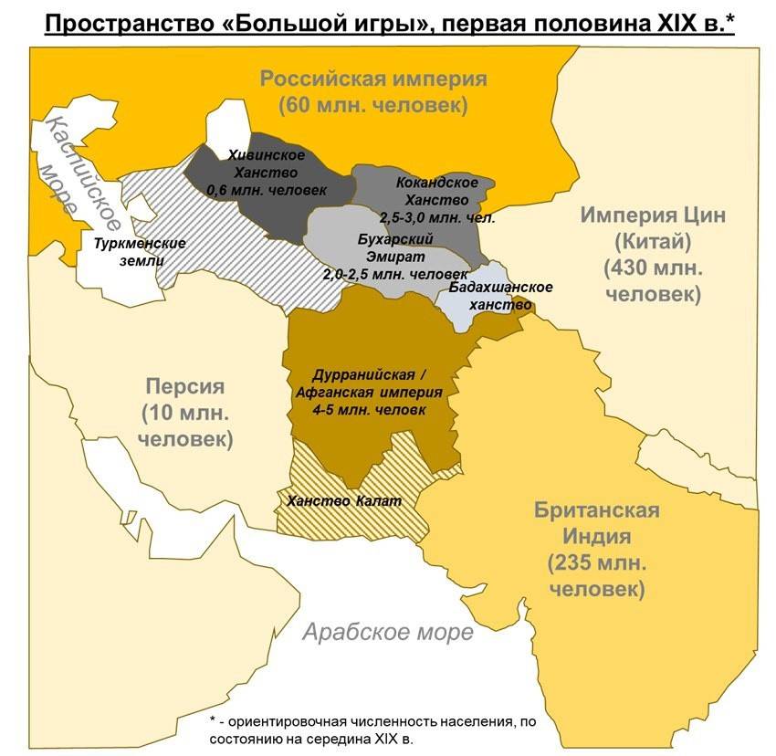 В действительности всё было совсем не так, как на самом деле. В труднодоступных местах, посреди пустынь и высоких горных хребтов, вдалеке от торговых маршрутов и экономических центров, не обладая актуальными и востребованными ресурсами, в Центральной Азии жили архаичные народности. До них никому не было дела кроме их непосредственных соседей, страдавших от набегов, грабежей и работорговли. В XVIII — начале XIX вв. эти соседи оказались в зоне интересов, а потом и под властью европейских стран, в планах которых не было движения дальше (см. Рисунок)