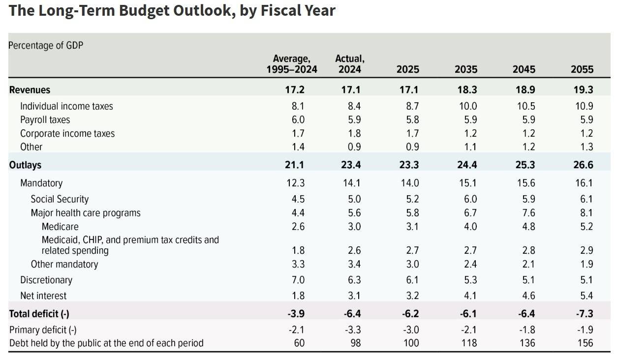 Доходы федерального бюджета США в среднем за последние 30 лет составляли 17,2% ВВП и в 2025 году составят 17,1%, с прогнозом роста до 18,3% в 2035 году и 18,9% в 2045 году (это прогнозировалось еще до "Большого красивого закона" Трампа, и теперь этого роста доходов не будет). Бюджетный дефицит был в 2007 году 1,1% ВВП, в 2025 году 6,2%, с очевидным приростом в основном за счет именно социальных и медицинских расходов (еще сильно выросли процентные расходы, но с низкой базы). На 2045 год дефицит прогнозируется чуть выше текущего на уровне 6,4% ВВП, но теперь без роста доходов дефицит вырастет до 8,2% ВВП (то есть доходы будут покрывать примерно две трети расходов, а дефицит и госдолг – еще треть).