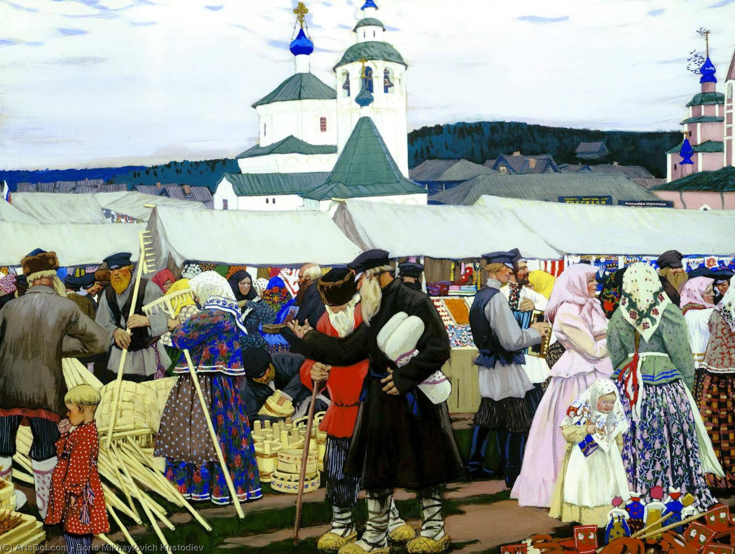 Живопись Бориса Кустодиева - словно лубок, лакированная шкатулка федоскинцев или палешан, развернувшаяся вдруг разноцветными холстами. Подобно тому, как «Конёк-горбунок» Петра Ершова непостижимым образом раскрылся народной сказкой, играющие красками картины Бориса Кустодиева будто вырастают из самого русского быта. Кустодиев берет напев, взятый Суриковым, и возводит его к настоящему гимну нашим традициям, вычурно родным узорам, творящей житие утвари, русской женщине и ослепительной зиме. Его песня льётся так естественно, точно из самого сердца народа.