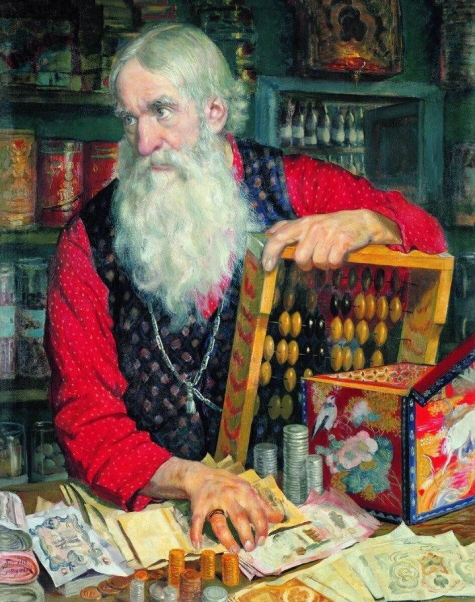 Кустодиев, прикованный после операции молодым к инвалидному креслу, мучаясь от боли, пролежней и дрожи в руках, в голодном, холодном послереволюционном Петрограде, создает образ великолепной Руси – солнечной, сытой, праздничной, пышущей здоровьем и душевным благодушием. Его дебелая купчиха с мраморной кожей и пунцовыми губами неспешно, словно пребывая в вечности, пьет чай за столом, ломящемся аппетитными яствами, виноградами, сахарным арбузом, изюмными кексами и вареньем, к покатому плечу чудо-бабы ластится кошка, вечереющий городок на фоне живет своей жизнью – променадами, чаепитиями у самовара, выгулом резвых лошадей («Купчиха за чаем», 1918). Вербный торг 1917 года пестрит народом с беспечными румяными полными лицами, протискивающимися к лавкам с вывесками «Птицы», «Рыбы», «Пряники», «Гарячiи кавришки», «Мебель», гигантские гроздья воздушных шаров развиваются над Красной площадью, голубое небо лоснится солнечными кучевыми облаками («Вербный торг у Спасских ворот на Красной площади в Москве», 1917; «Вербный торг у Спасских ворот в Москве», 1917). «Купец» в красной рубахе 1918 года, твердо уверенный в завтрашнем дне, крепкой рукой прибирает пересчитанные богатства, поражающие воображение своими размерами. Кустодиев пишет те самые кисельные берега и молочные реки, о которых от века мечтает каждый русский человек.