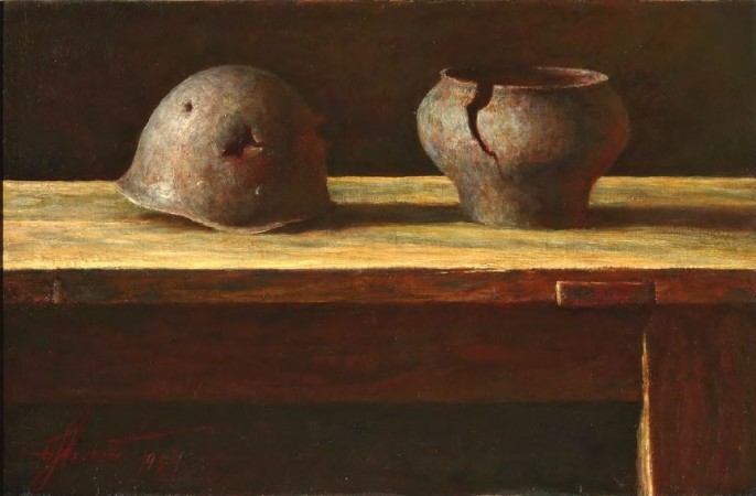 Натюрморт «Память Смоленской земли» (1983) – это преддверие сорокалетия Победы. Неменский обращается к символизму, не показывая ни людей, ни рвы, ни боевую технику. Всё спрессовывается до предметности – пробитая каска и треснувший чугунок. Ратный подвиг неизвестного героя и чудом уцелевшая крестьянская посудина.