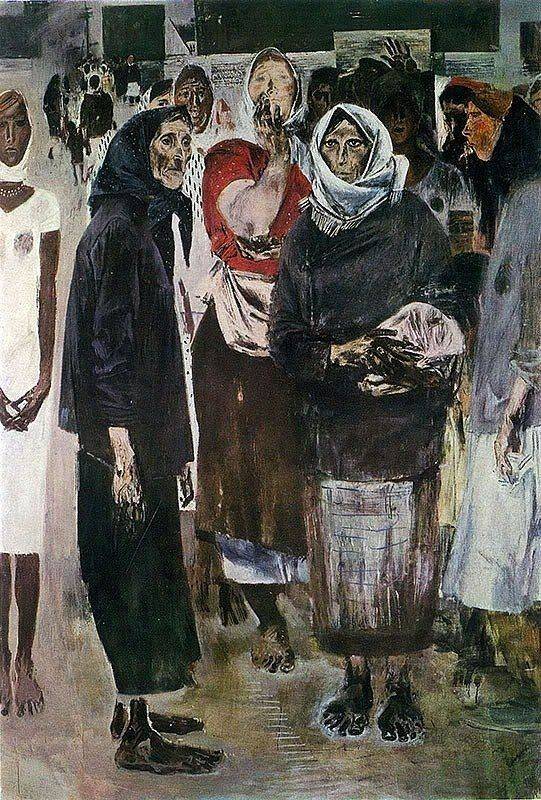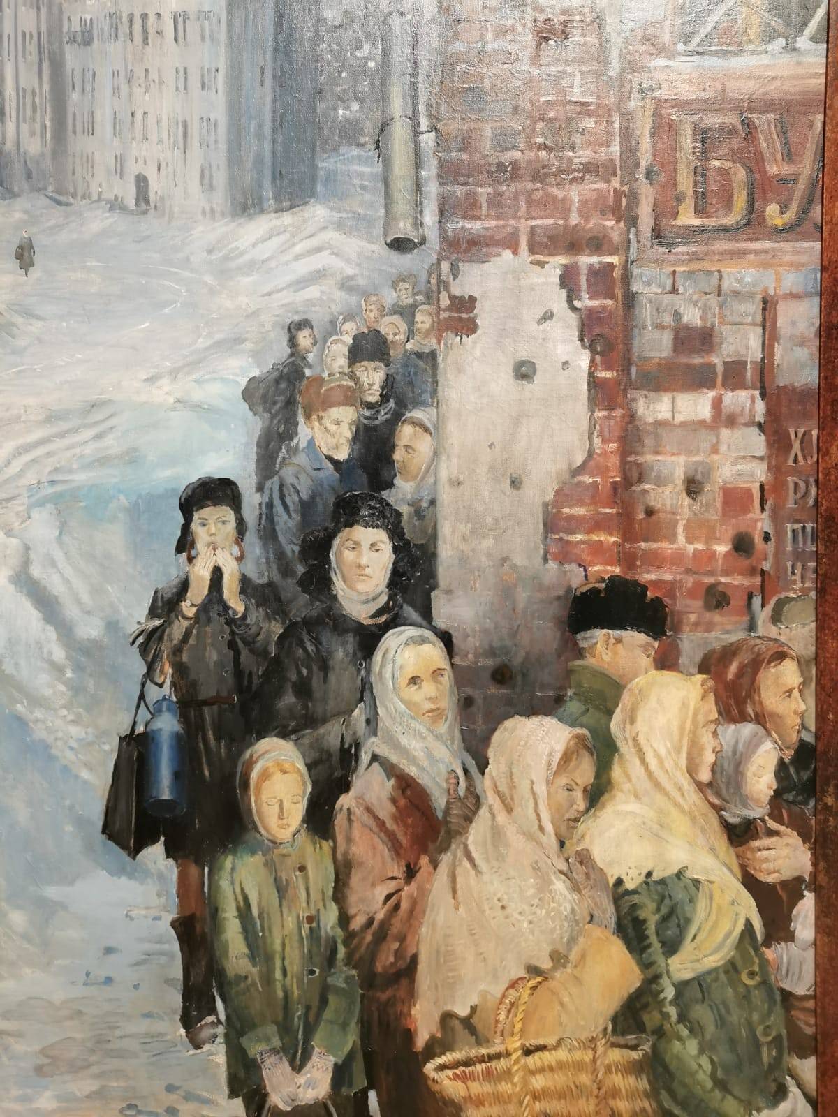 Юрий Пименов представлен картиной «Военный хлеб. 1941 год» (1972-1973). У мастера есть несколько подобных работ-воспоминаний о военной године, когда он, находясь в Москве, работал в «Окнах ТАСС». Пименов изобразил очередь за хлебом осенью 1941 года, когда в столице было крайне тревожно – немцы в свои полевые бинокли уж видели кремлёвские звёзды, заранее празднуя триумф, а провокаторы вбрасывали информацию, что город вот-вот сдадут противнику. Было студёно и жутко. Это и отобразил Пименов.