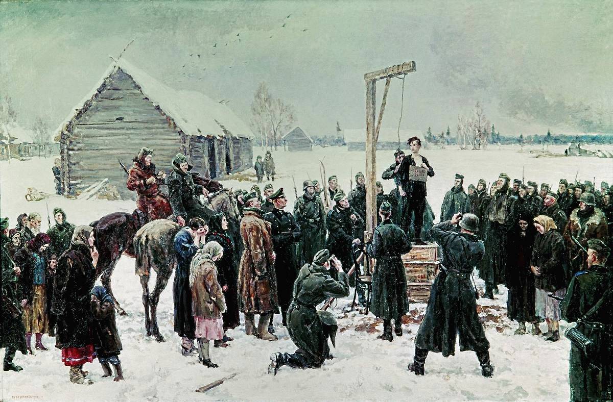«Зоя Космодемьянская» (1942-1947) Кукрыниксов – казнь вчерашней школьницы, проявившей такую выдержку, что это испугало и озадачило фрицев. Как могут нежные создания быть жёстко-непоколебимыми? На картине мы видим не только плачущих сограждан, но и врагов, которые ведут себя по-разному – наиболее циничные фотографируют (нацисты вообще любили фиксировать свои «подвиги», что и облегчило ведение дел на Нюрнбергском процессе), другие же стоят растерянные – им до сих пор непонятно, куда они пришли. Пруссаков ждёт позорная гибель – они ублюдки цивилизации.