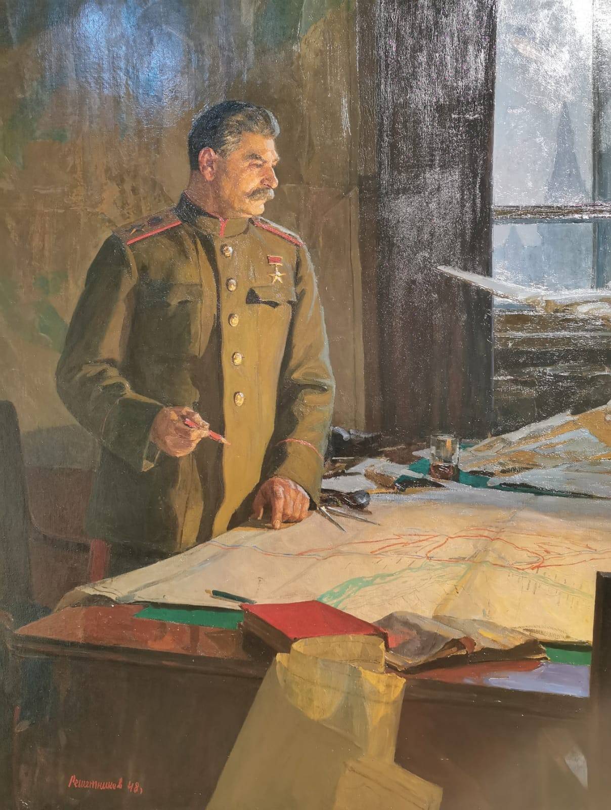 Ещё в середине 1930-х идеи Мировой Революции с её неистовым космополитизмом сменились патриотическими концепциями. На первый план вышли видные деятели прошлого: русские государи – Иван Грозный и Пётр I, учёные, поэты и полководцы. В военную пору не было фигуры актуальнее, чем Александр Невский. Художник Павел Корин пишет князя в фантазийном рыцарском облачении, опирающегося на меч и смотрящего вдаль – не покажется ли очередной ворог. На выставке показана лишь центральная и самая популярная часть триптиха (1942), созданного в очередную годовщину Ледового побоища.