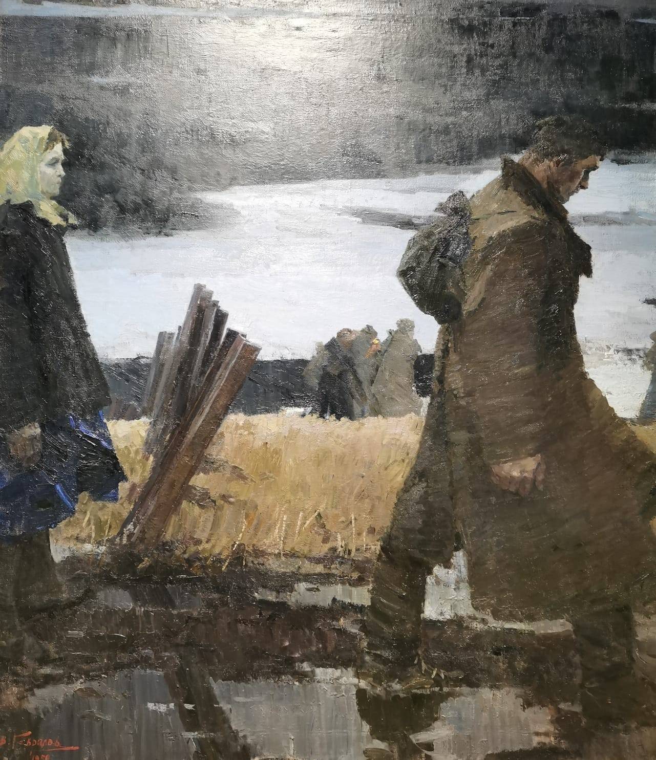 Живописец Игорь Обросов написал «Встречая и провожая эшелоны» (1980), как воспоминание о матери, которая в годы войны работала военврачом. «Всё, что было не со мной помню…», - как пелось в песне на стихи Роберта Рождественского. И Обросов помнил. Перед нами – доктора в ватниках и шинелях, накинутых поверх белых халатов. Ждут поезда с ранеными. Хроническое недосыпание – это самое мелкое из того, что испытали военные эскулапы.