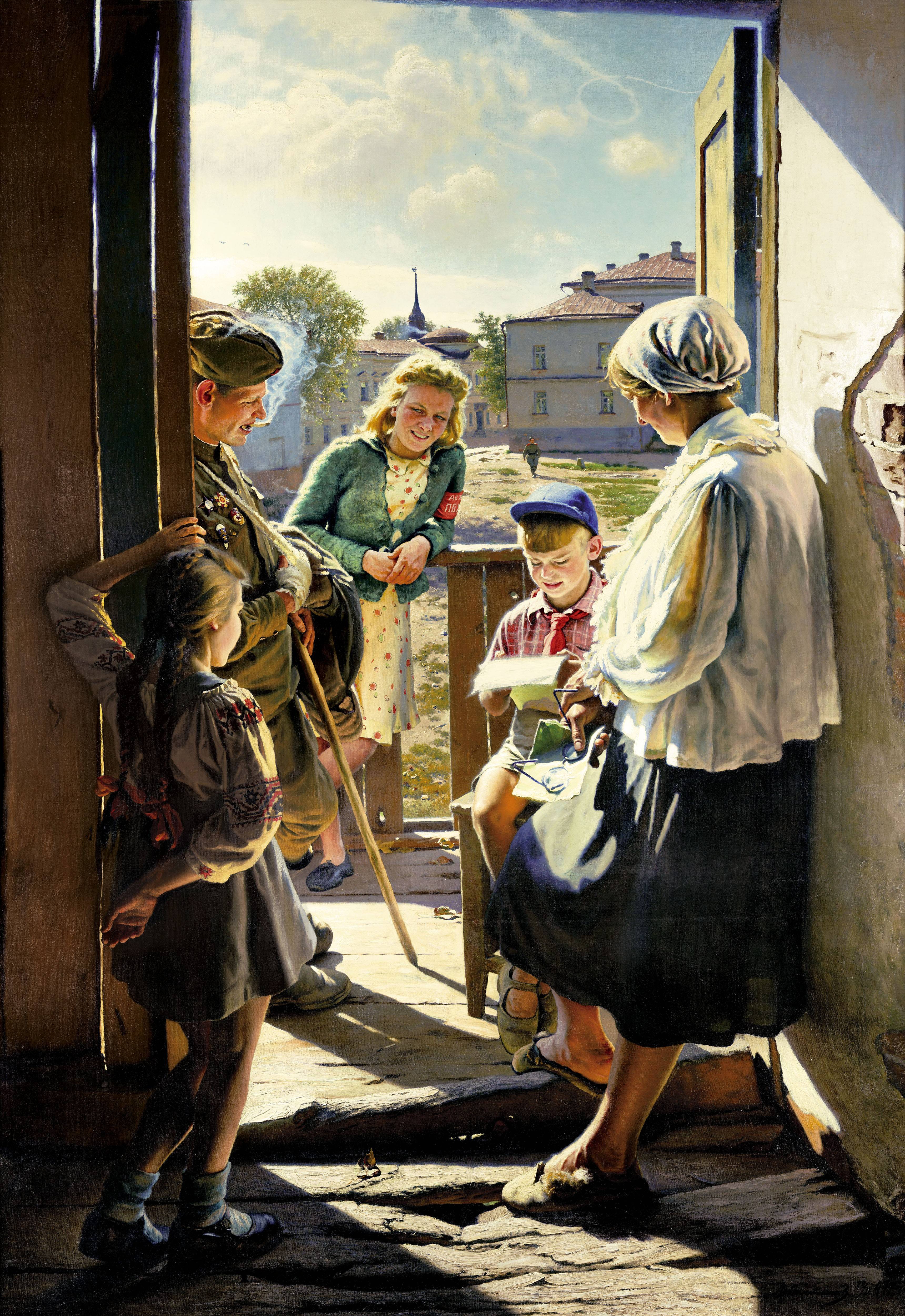 Хрестоматийная «Мать партизана» (1943) Сергея Герасимова – мощное, пафосное произведение. Босая женщина выступает, как вселенская матерь, вышедшая на бой против сатаны. Примечательно, что немецкий офицер, несмотря на свою корпулентность, выглядит суетливо-жалким. Оккупанты всегда убоги, даже, если за ними стоят неисчислимые силы. Картина полна света, и эта солнечность – на контрасте с происходящим. И молоденького партизана, и его мать ждёт неминуемая казнь. Однако эти герои попрали смерть, оставшись для нас вечно-живыми.