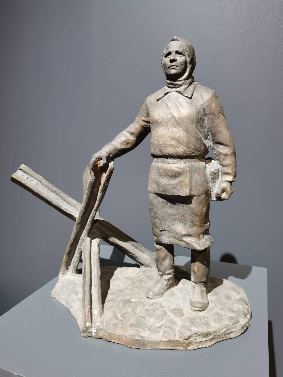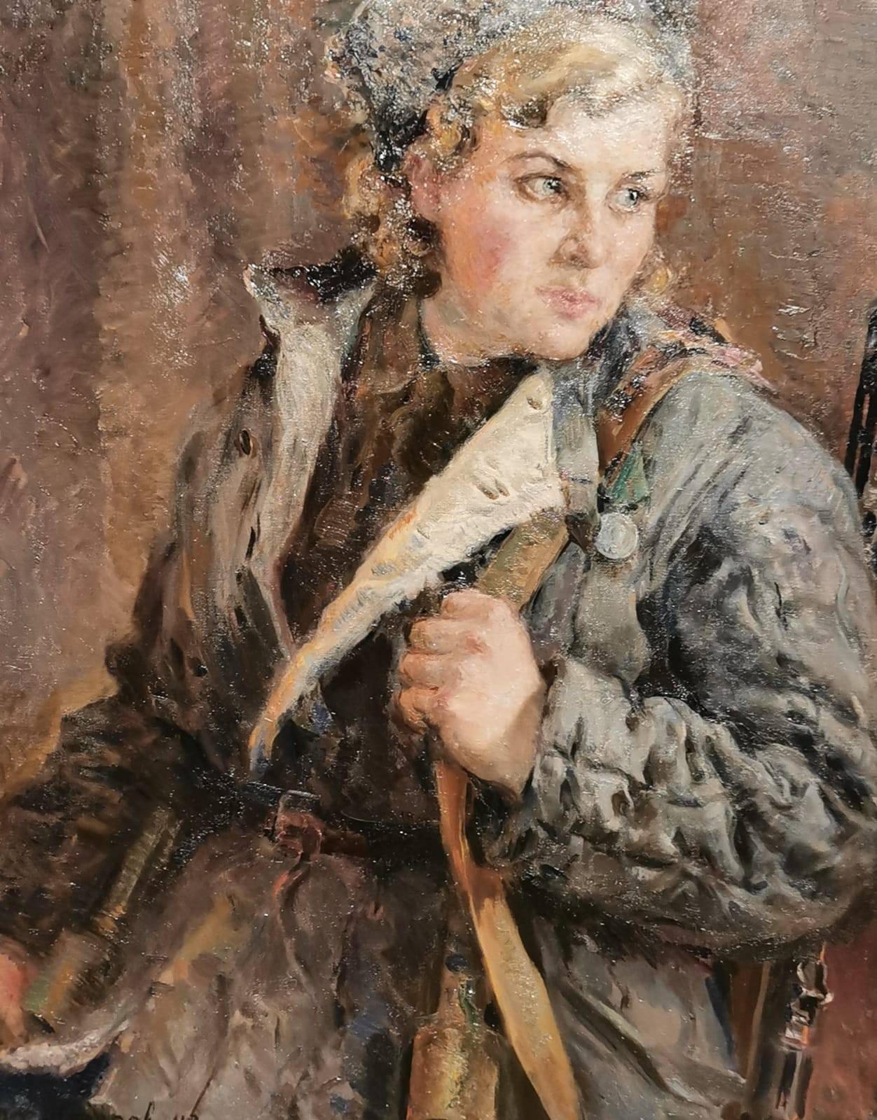 Тут же скульптура Генриха Манизера, изображающая Зою (1940-е гг.) и голова партизанки (1942) работы Веры Мухиной. «Шумел сурово Брянский лес, / Спускались синие туманы, / И сосны слышали окрест, / Как шли на битву партизаны», - поётся в знаменитой песне. Интересна картина «Портрет Лидии Осмоловской» Фёдора Модорова. Осмоловская – белорусская партизанка, она была подпольщицей в Климовичах и участвовала в организации побегов военнопленных. Больше того – устроилась секретарём к одному из высокопоставленных фашистов и сделала так, что он попал в партизанскую ловушку. Это была красивая, рисковая девчонка. Художник изобразил её в партизанском тулупе, с оружием, но завитую по моде. Разве ж возможно победить такой народ? К слову, сам Фёдор Модоров часто выезжал на фронт и в партизанские отряды, где написал более шестидесяти портретов.