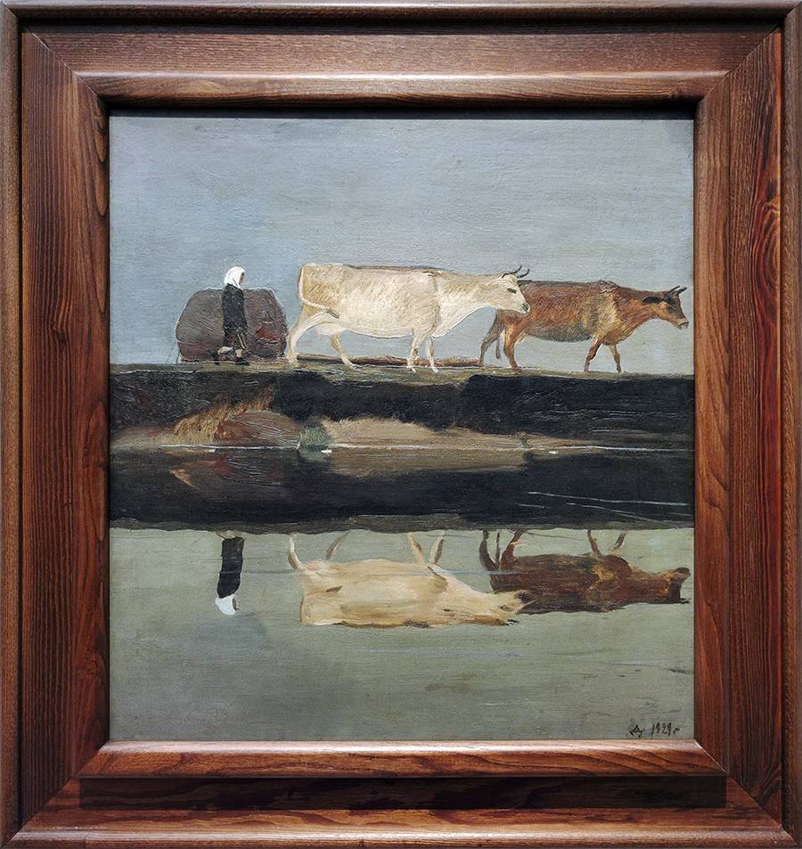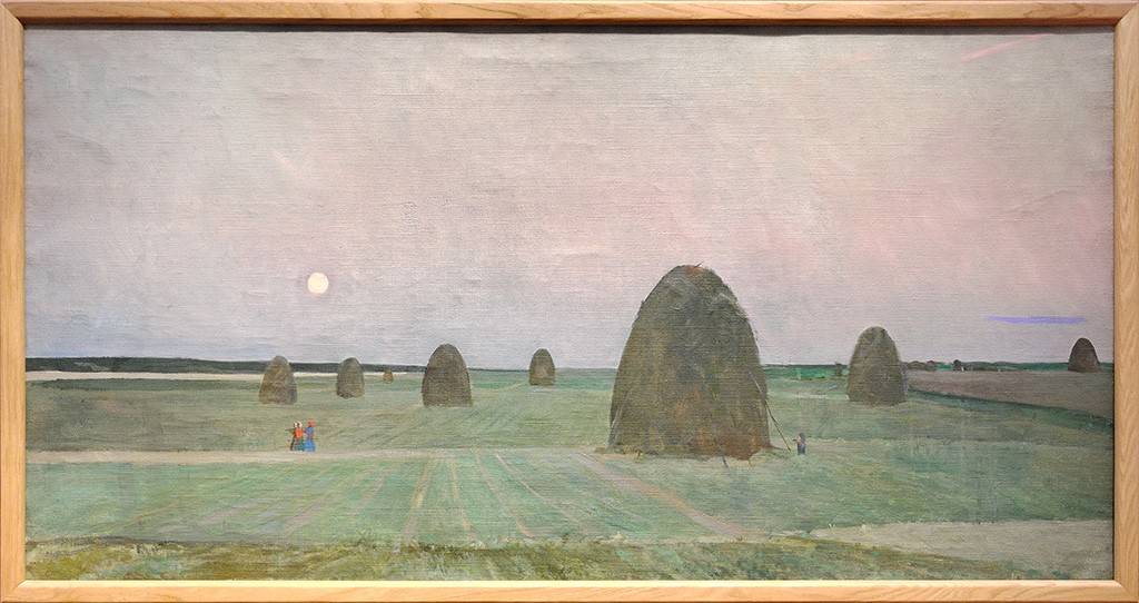 Его по-прежнему влекут красавицы. Великолепен портрет архитектора Тамары Милёхиной (1948-1949). Эффектная дама сидит в кресле, на ней модное «с плечиками» платье глубоко-бордового цвета. Рядом – скульптура обнажённой спортсменки, сделанная в 1930-х годах – надо сказать, что в искусстве 1940-1950-х практически не встречается «ню». Всё чаще мастер обращается к природе, как к источнику вдохновения. Тому примеры – «Вечер в полях. Пейзаж со стогом» (1949), «Георгины и флоксы» (1950-е гг.), «Вечер в Подрезкове» (1958).