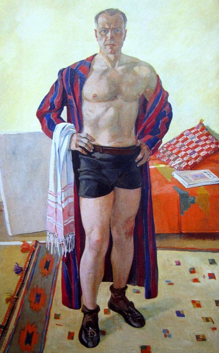 Но пришла она, Победа! Во второй половине 1940-х Дейнека создаёт одну из лучших своих картин – «Эстафета по кольцу Б». Интенсивный день, соревнования, зрители, флаги. Всё дышит спокойствием, несмотря на жёсткую динамику момента. Послевоенный стиль – триумфальный, где-то расслабленный. Тут нет никакой резкости, свойственной 1920-1930-м годам. Тогда же художник пишет свой автопортрет после тренировки (1948). Дейнеке почти пятьдесят лет, и он в своей лучшей физической форме.