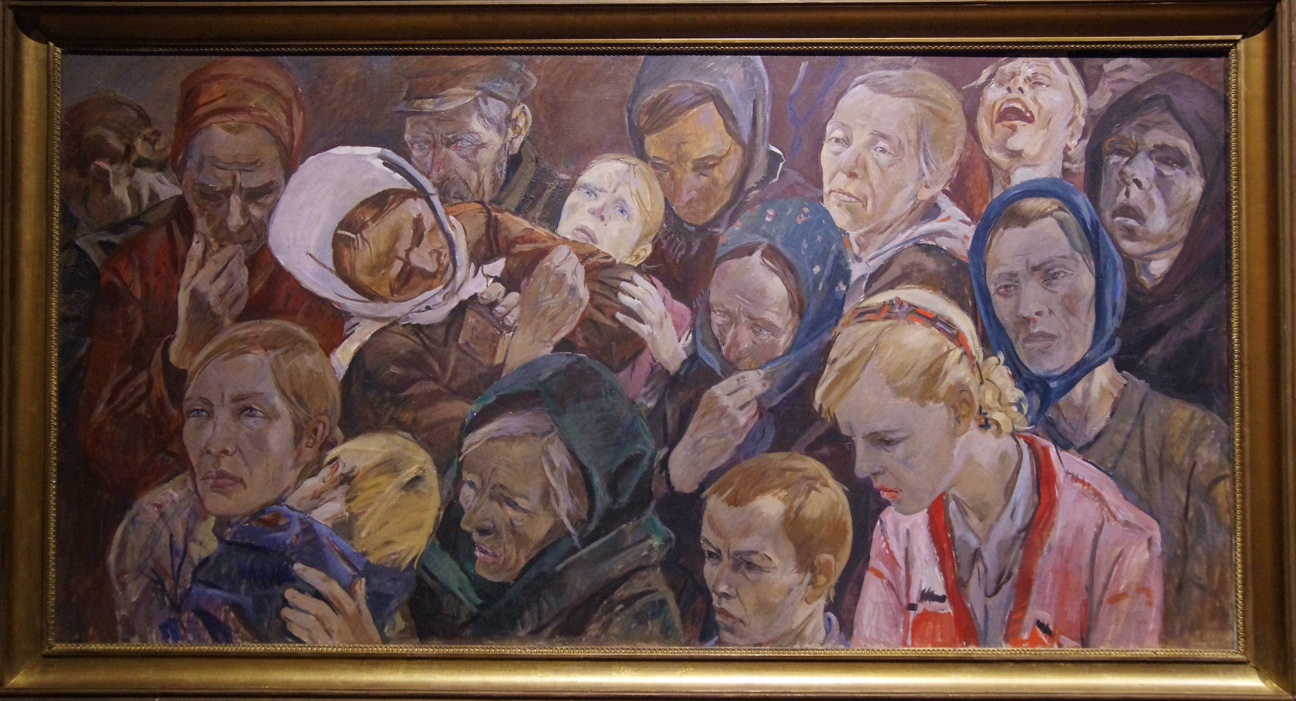 Во время войны Дейнека жил в Москве, работая над военно-патриотическими плакатами в «Окнах ТАСС», создавал тревожащие картины «Сожжённая деревня» и «Окраина Москвы». Вместе со своим другой Георгием Нисским он совершил поездку на фронт под Юхнов. Прочувствовать, понять глубину горя и патетику битвы – вот задача мастера. «В оккупации» (1944) — это скорбные лица, даже – лики. Это несломленная надежда. Это – вера в жизнь.