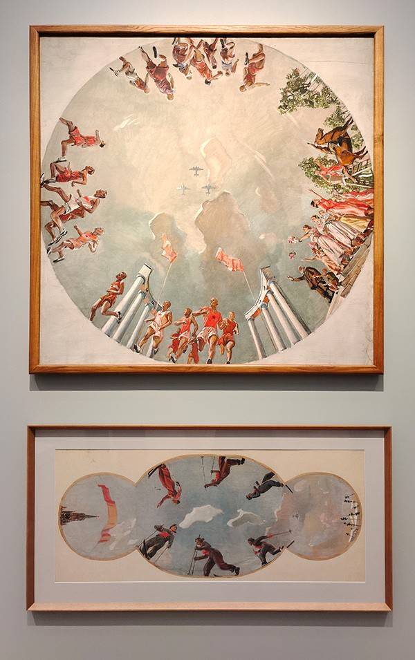 А что же на Родине? В середине 1930-х это парк Горького был не только местом встреч и гуляний – его замышляли, как пролетарский Версаль, где всё дышит небывалой роскошью, при том, что весь этот блеск – для всех и каждого. На выставке можно увидеть эскизы фресок для кинотеатра в ЦПКиО имени Максима Горького – «Танец» и «Физкультурники». Излюбленная тема спорта – эскиз росписи плафона для здания Центрального театра Красной армии (1937). Мускулистые бегуны, освещённые солнцем колонны, бескрайние небеса и в головокружительной выси – три самолёта. Чтобы тело и душа были молоды!