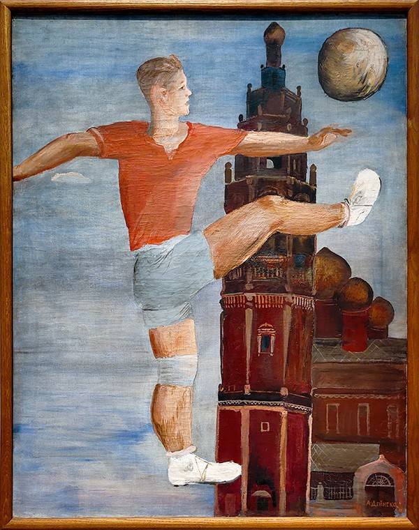 В Государственной Третьяковской Галерее (в здании на Кадашевской набережной) сейчас проходит масштабная выставка «Гимн жизни», где Александр Дейнека представлен как живописец, рисовальщик, иллюстратор и создатель эскизов для мозаик московского метро. Точка сборки – «Футболист» (1932). Картина смелая и наивная. Юноша ударяет по мячу, а фоном – колокольня. Ветхое и – свежее. То, от чего ушли и то, куда стремимся. Вспоминается футболист Володя Макаров из романа Юрия Олеши «Зависть» с рассуждениями о торжестве новизны: «Я хочу быть машиной. Зависть взяла к машине – вот оно что! Чем я хуже её? Мы же её выдумали, создали, а она оказалась куда свирепее нас». Перед нами именно такой человек-машина со стальными мускулами – безупречный герой конца 1920-х – начала 1930-х годов.