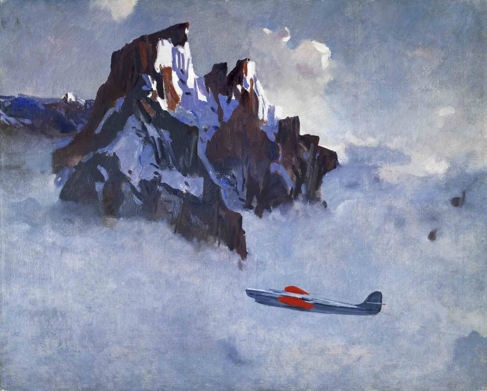 Тема самолёта – постоянная в творчестве художника. «Над снегами» (1938), «В воздухе» (1932) «Крым. Вираж над морем» (нач. 1930-х гг.) – это песнь бесконечного пространства, одолеть которое представляется немыслимой дерзостью, но, как пелось в песне: «Нам разум дал стальные руки-крылья, а вместо сердца – пламенный мотор!» Дейнека, помимо всего прочего, увлекался техникой. Впрочем, ею интересовались все молодые люди. К слову, эти картины чем-то напоминают по стилю вещи Георгия Нисского, с которым Дейнека плодотворно общался. Больше того! Они вместе тренировались – оба хороши собой, подтянуты и нравятся девушкам.