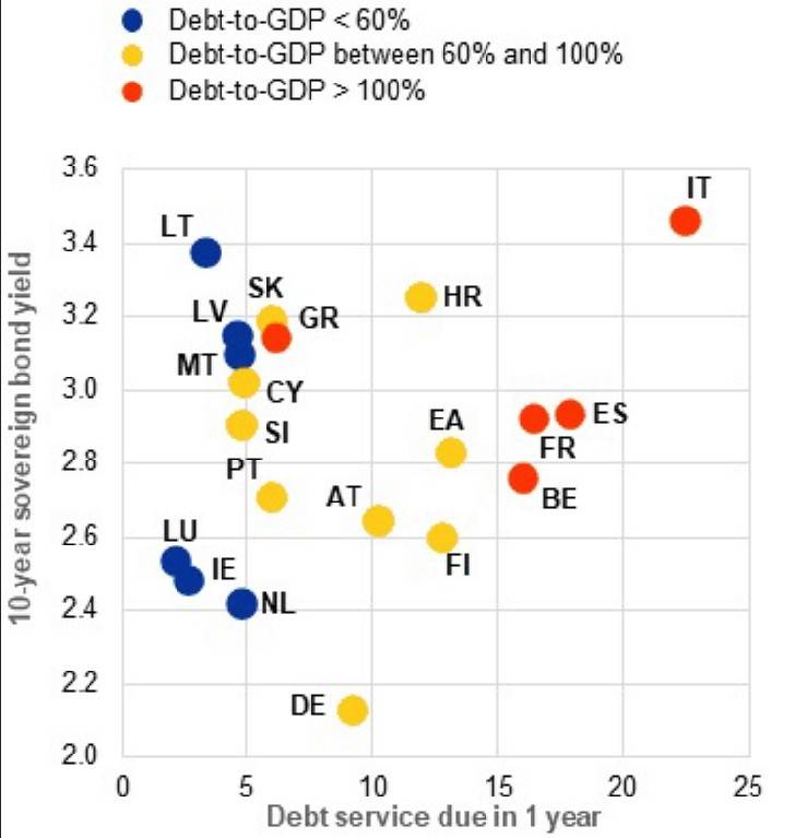 Для примера представим один из таких графиков, а именно проценты по гособлигациям (ось Y) и потребность в рефинансировании долга в ближайший год (ось Х). Крупнейшие после Германии Франция (FR), Италия (IT), Испания (ES), а также примкнувшая к ним средняя Бельгия (BE) находятся в красной зоне с долгом более 100% ВВП (debt-to-GDP>100%). Германия как локомотив и оплот еврозоны помещена авторами обзора в жёлтую зону, а в безопасной синей зоне – сплошь карликовые страны и средние по размерам Нидерланды. Процентные ставки по гособлигациям этих стран сейчас около 3% годовых при снижающихся ставках ЕЦБ и инфляции, хотя всего лишь несколько лет назад ставки по гособлигациям были 0-1%. Этим странам необходимо рефинансировать 16-18-23% огромного долга ежегодно (средний срок обращения большей части гособлигаций обычно 5-10 лет). Политики чаще предпочитают говорить о дефиците бюджета, манипулируя цифрами в 3-4%, но гораздо правильнее и нагляднее было бы указывать на в разы большие потребности в рефинансировании долга.