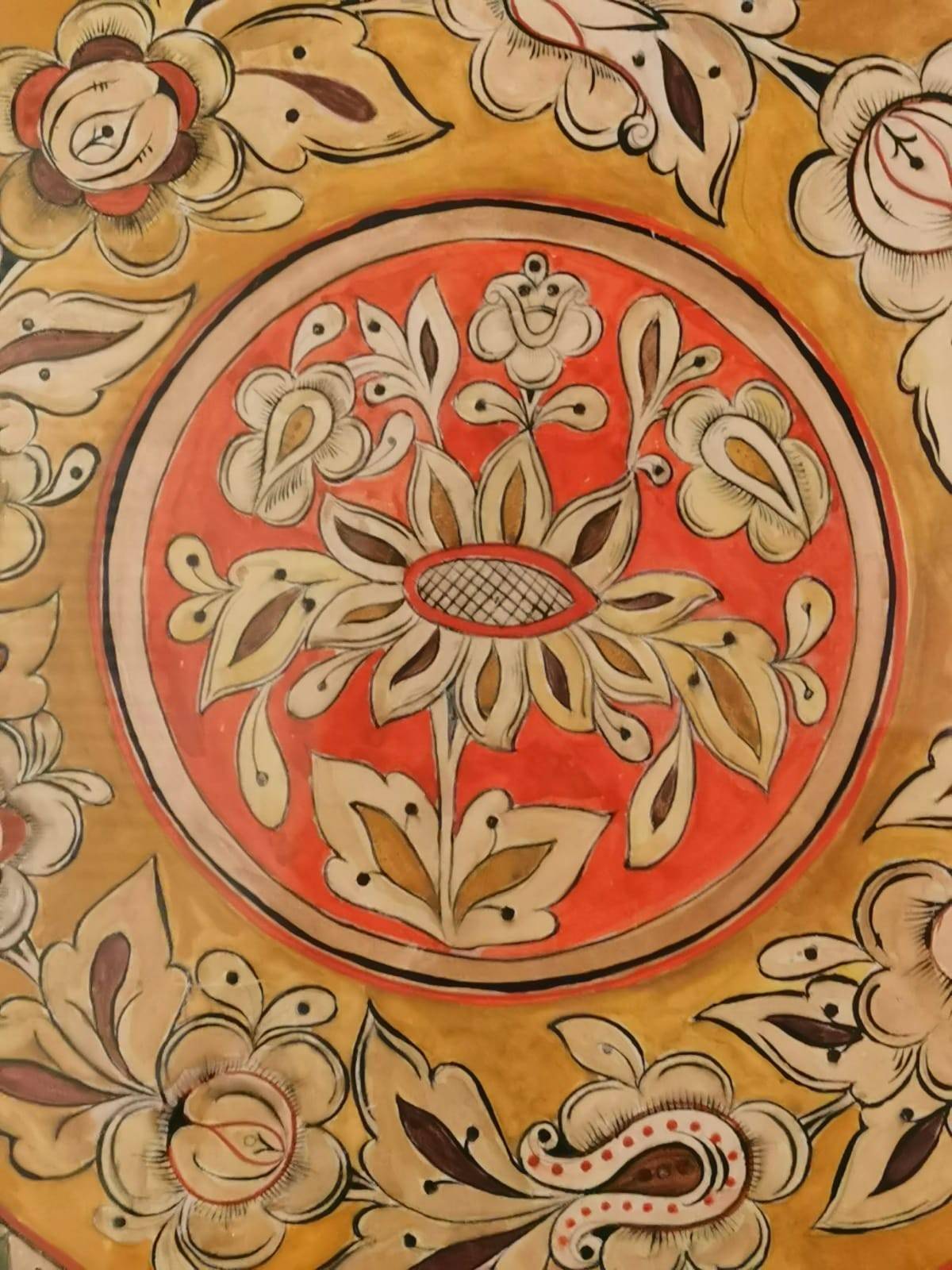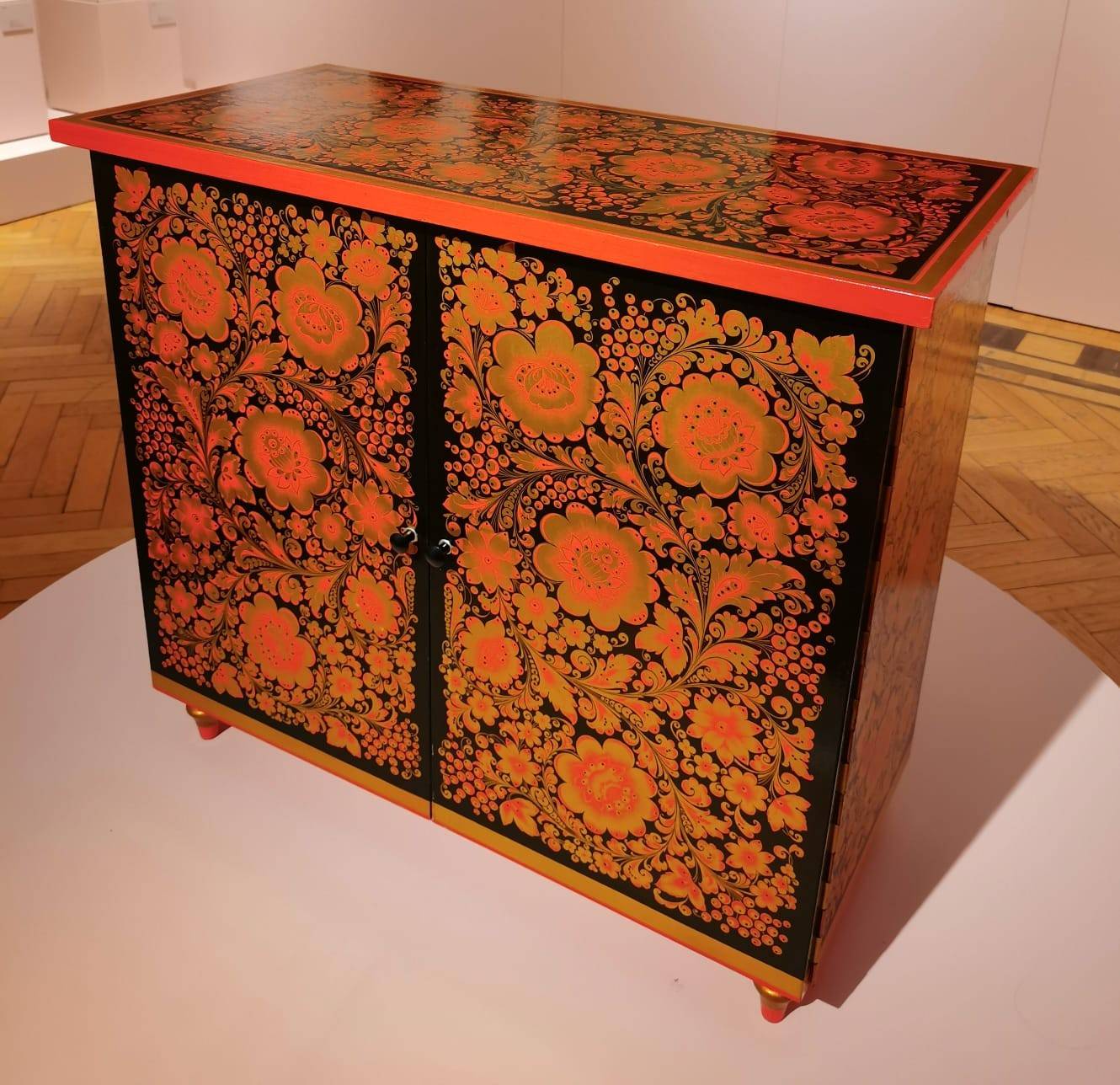 Хохлома усложняет роспись – буйные виньетки, россыпь потрясающих цветов, созвучие трав и листьев. Всё максимально закручено. Тому пример – панно «Птица», где хвост птицы больше напоминает веер. Здесь же тумбочка, расписанная так богато, что невозможно разглядеть отдельные фрагменты.