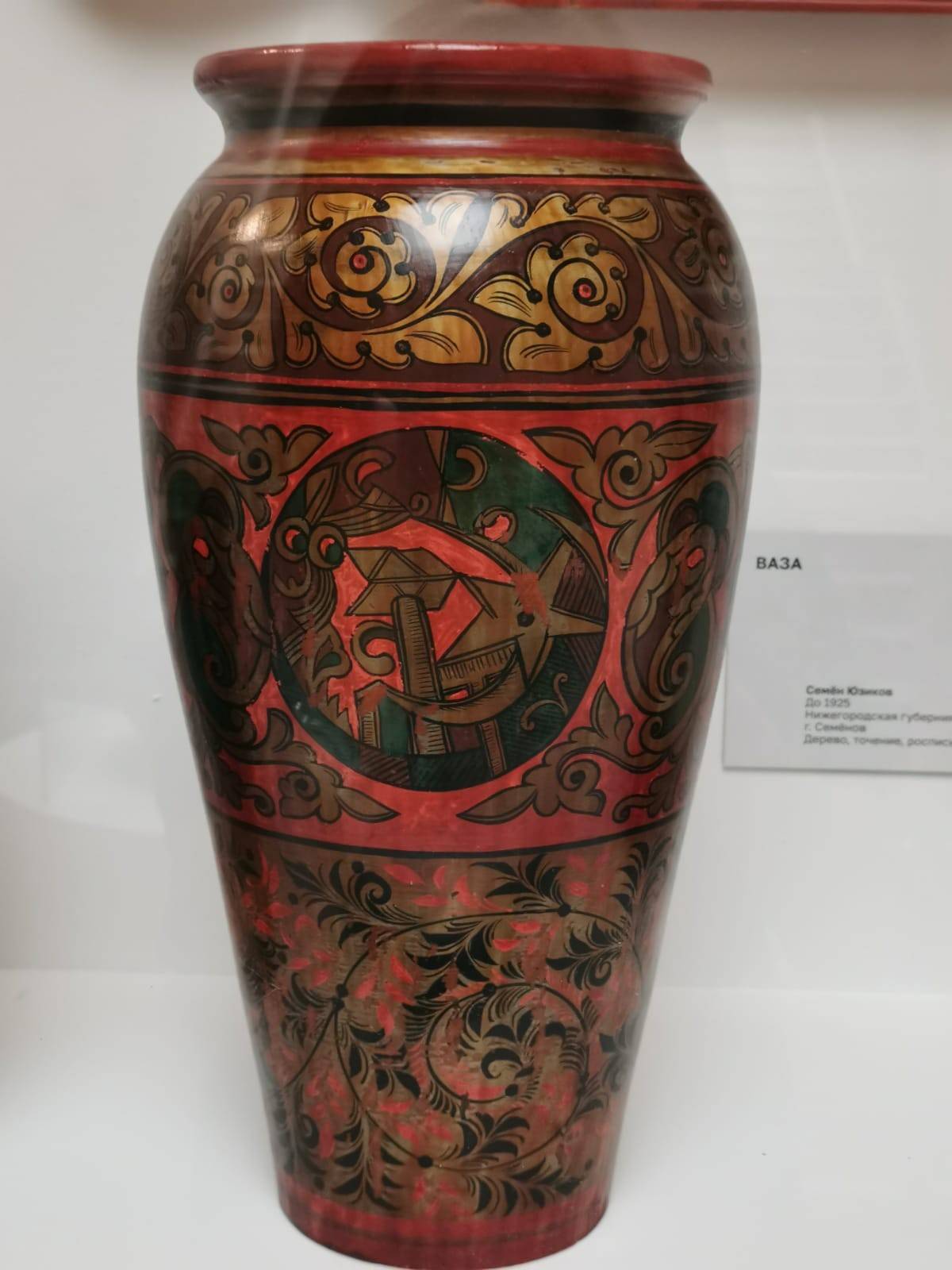 Специально для Парижа были созданы уникальные хохломские предметы – старинные формы плюс большевисткая символика. Таким образом, серп и молот, пятиконечная звезда, лозунги оказались искусно вписаны в «ягодные» узоры и растительный орнамент. В 1920-х годах было востребовано это направление – «пролетарский» фарфор с портретами вождей и надписями в духе: «Владыкой мира будет труд!», тканевые узоры с аэропланами и радиомачтами, прозодежда Варвары Степановой для труда и отдыха. Тогда мечталось о создании принципиально нового быта, слога, смысла, изобразительного искусства.