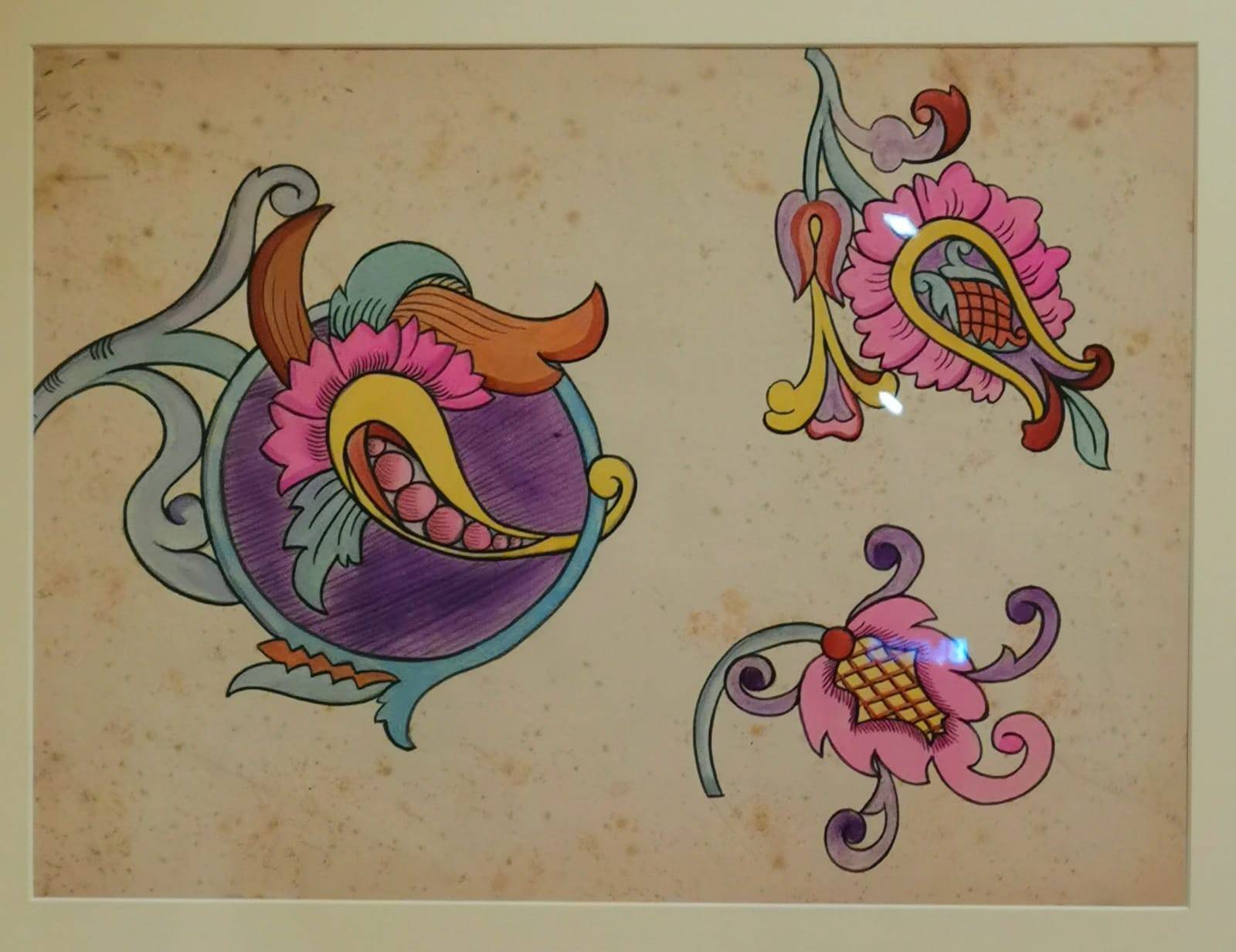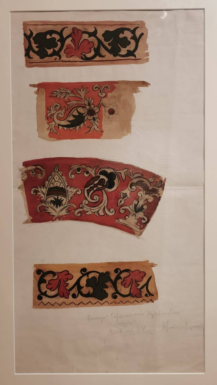 В 1950-х вырабатывается прихотливый почерк, появляется склонность усложненной росписи, напоминающей парчовую ткань. Типовые мотивы соседствуют с восточными узорами и фантастическими образами. Хохломские орнаменты начинают проникать в другие материалы - керамику, фарфор, стекло. Этот период заложил основы для дальнейшего развития промысла, доказав его способность органично вбирать новые художественные веяния, сохраняя при этом свою исконность. В экспозиции явлены разнообразные эскизы чаш, ковшей и блюд – везде сложный, изобильный рисунок. Поражает блюдо Ольги Батуриной «Цветы» - чёткость прорисовки, праздничность, преизбыточная нарядность. Это «слишком» даже для хохломы.