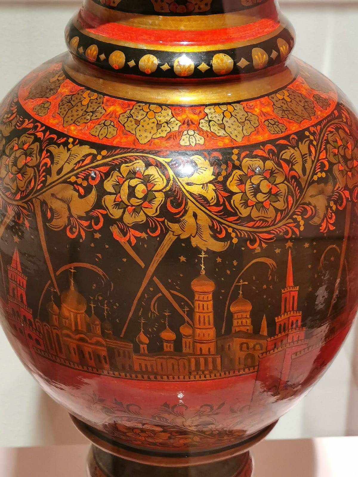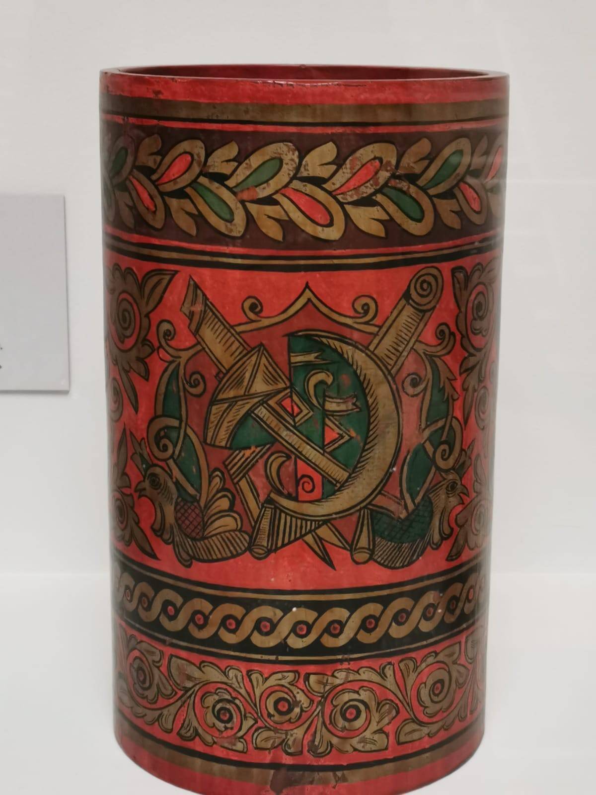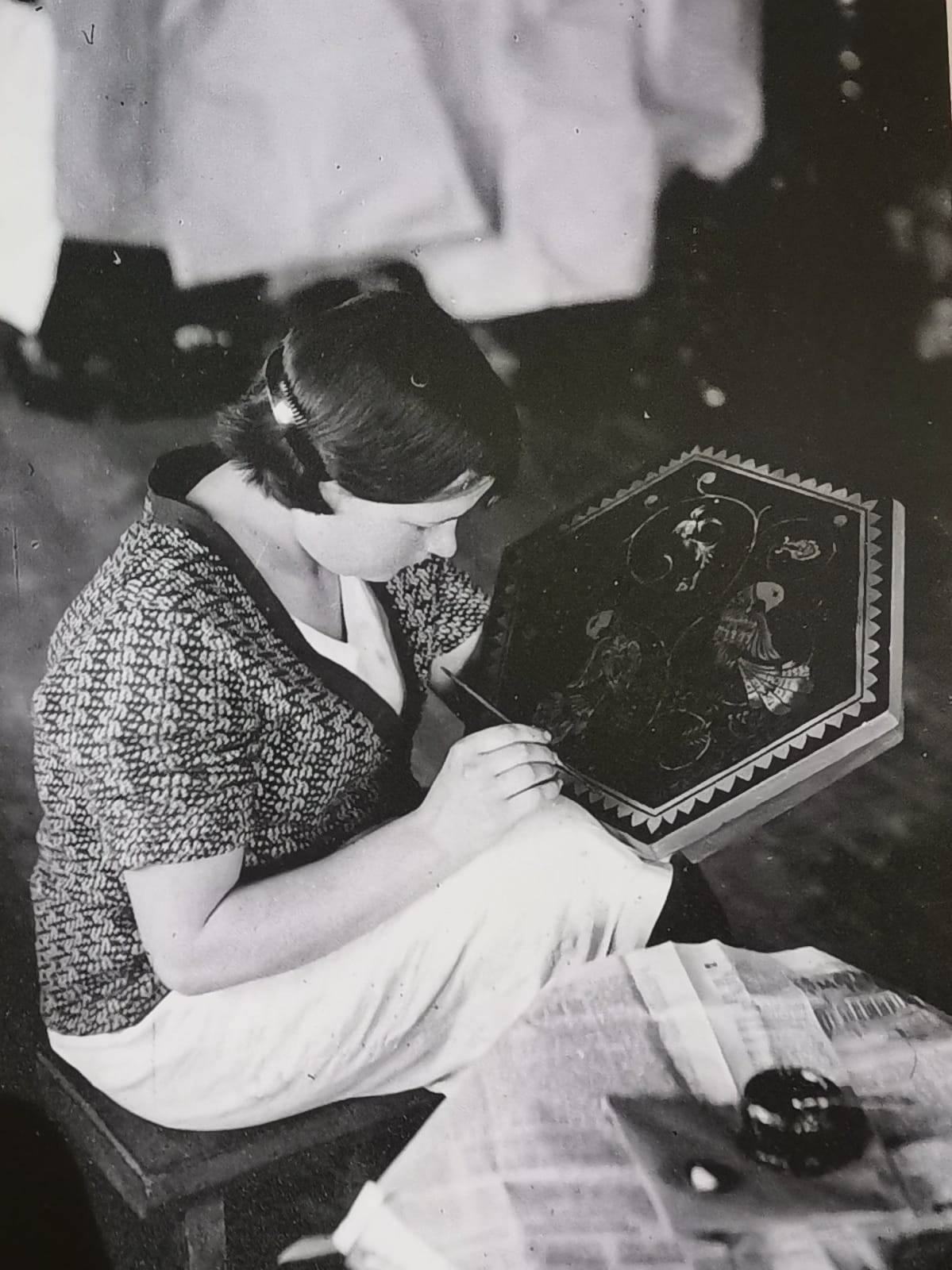 В 1930-х годах революционная символика уже не попадалась, так как резко поменялся вкус – был взят курс на традицию. Поэтому вещи, выполненные в предвоенном десятилетии – это типичная хохлома, изредка приправленная выдумкой. Так, невероятно эффектны ковши с ручками в виде змей. На одной из фотографий мы видим неизвестную мастерицу 1930-х, склонившуюся над росписью панно. Ускоренная электрификация вызвала появление современных форматов – так, на выставке представлены подставки под лампы, созданные в 1920-1930-х годах.