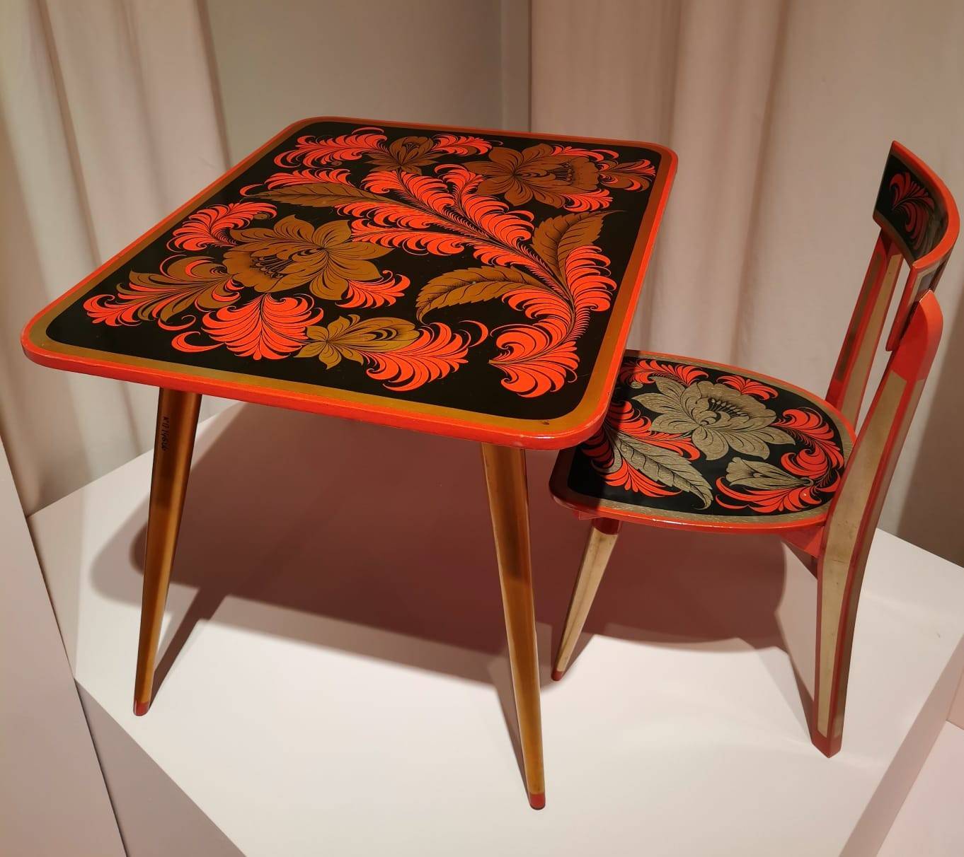 В 1960-х хохломские изделия стали использовать для декорирования квартир – модерновая меблировка была безыскусной, поэтому требовались яркие детали. Началось производство детской мебели. Вот – столик и стул, созданные для малышей. Всё – в духе 1960-х – тонкие, конусообразные ножки, а столешница расписана цветами и травами.