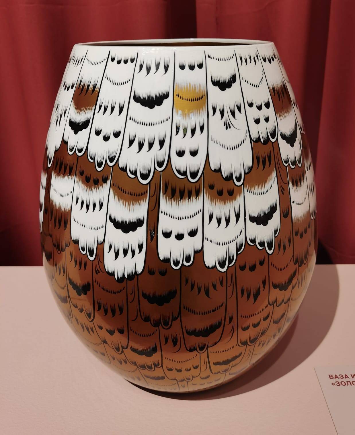 Упадок отрасли пришёлся на 1990-е годы, а потом - медленное возрождение. На выставке имеются и современные варианты, сработанные в коллаборации бренда «Хохлома» с модельером и дизайнером Алёной Ахмадуллиной. Она придумала удивительную коллекцию одежды, мебели, игрушек и ювелирных украшений. Ахмадуллина и до этого в своих произведениях использовала сказочные сюжеты и фольклорные мотивы. В союзе с хохломским производством ей удалось соединить травные орнаменты с современным прочтением. Так появилась линейка с выразительными узорами и по-новому поданными мотивами райских птиц, сказочных рыб, цветов и ягод.