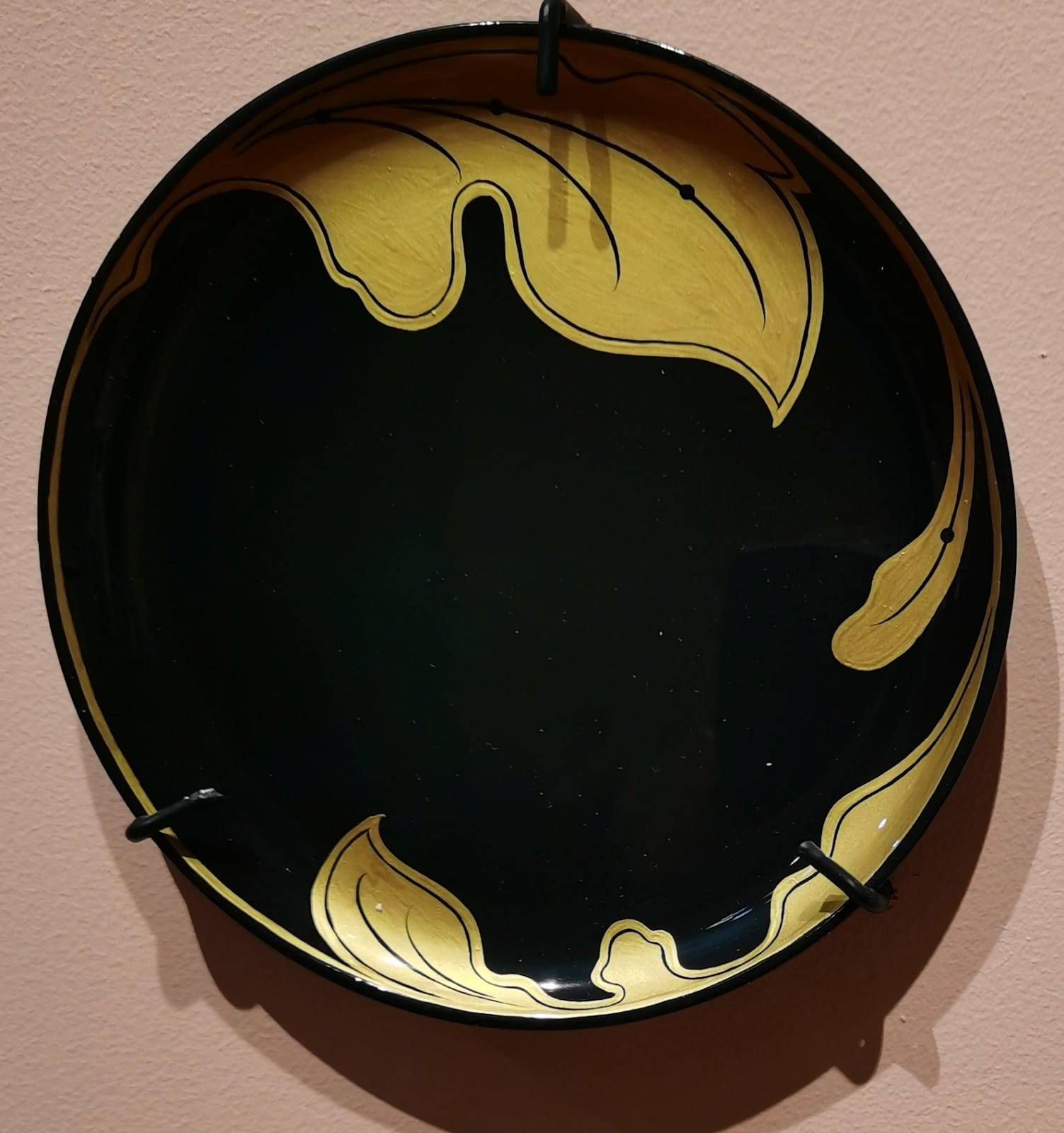 Лаконичность, геометризм, простота – вот обязательные условия оттепельной манеры. Коснулось это и хохломских росписей. Перед нами – блюдо «Рыбки» работы Зои Архиповой. Никаких «бесполезных» деталей, а рыбки – всего лишь силуэт. Столь же лапидарно выполнено панно Екатерины Доспаловой – изящные красно-чёрные сполохи на золотом фоне.