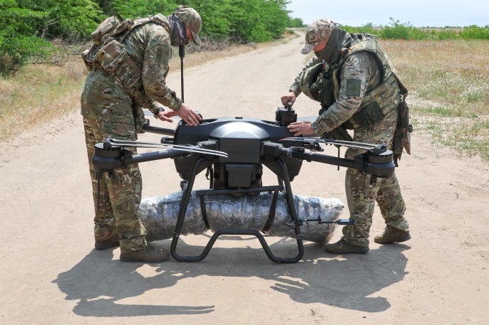 Фото: Александр Полегенько/ТАСС. Запорожская область. Военнослужащие службы материально-технического обеспечения ВДВ во время демонстрации возможностей БПЛА.